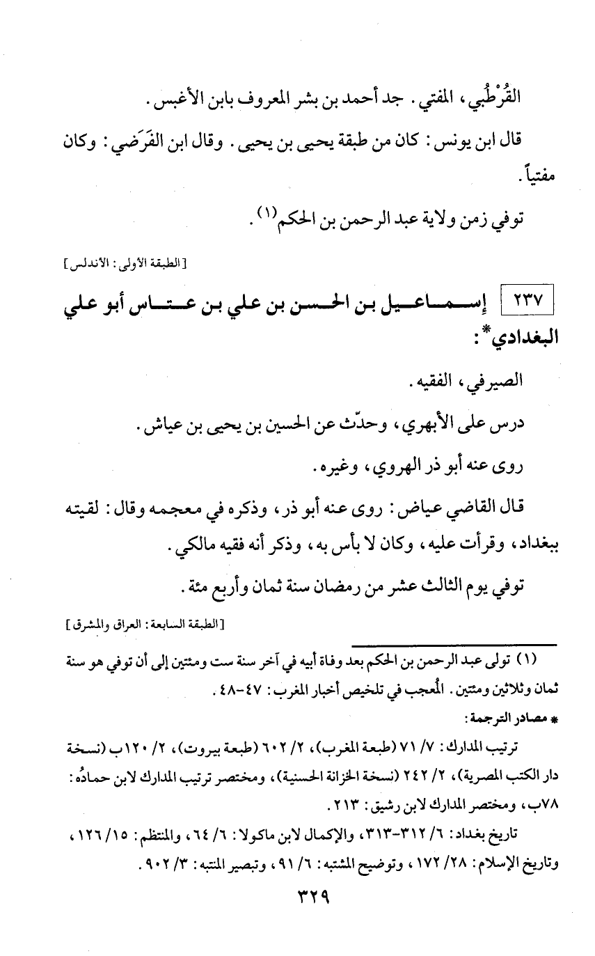* مصادر الترجمة: ترتيب المدارك: 7/ 71 (طبعة المغرب)، 2/ 602 (طبعة بيروت)، 2/ 120 ب (نسخة دار الكتب المصرية)، 2/ 242 (نسخة الخزانة الحسنية)، ومختصر ترتيب المدارك لابن حماده: 78 ب، ومختصر المدارك لابن رشيق: 213. تاريخ بغداد: 6/ 312 - 313، والإكمال لابن ماكولا: 6/ 64، والمنتظم: 15/ 126، وتاريخ الإسلام: 28/ 172، وتوضيح المشتبه: 6/ 91، وتبصير المنتبه: 3/ 902.