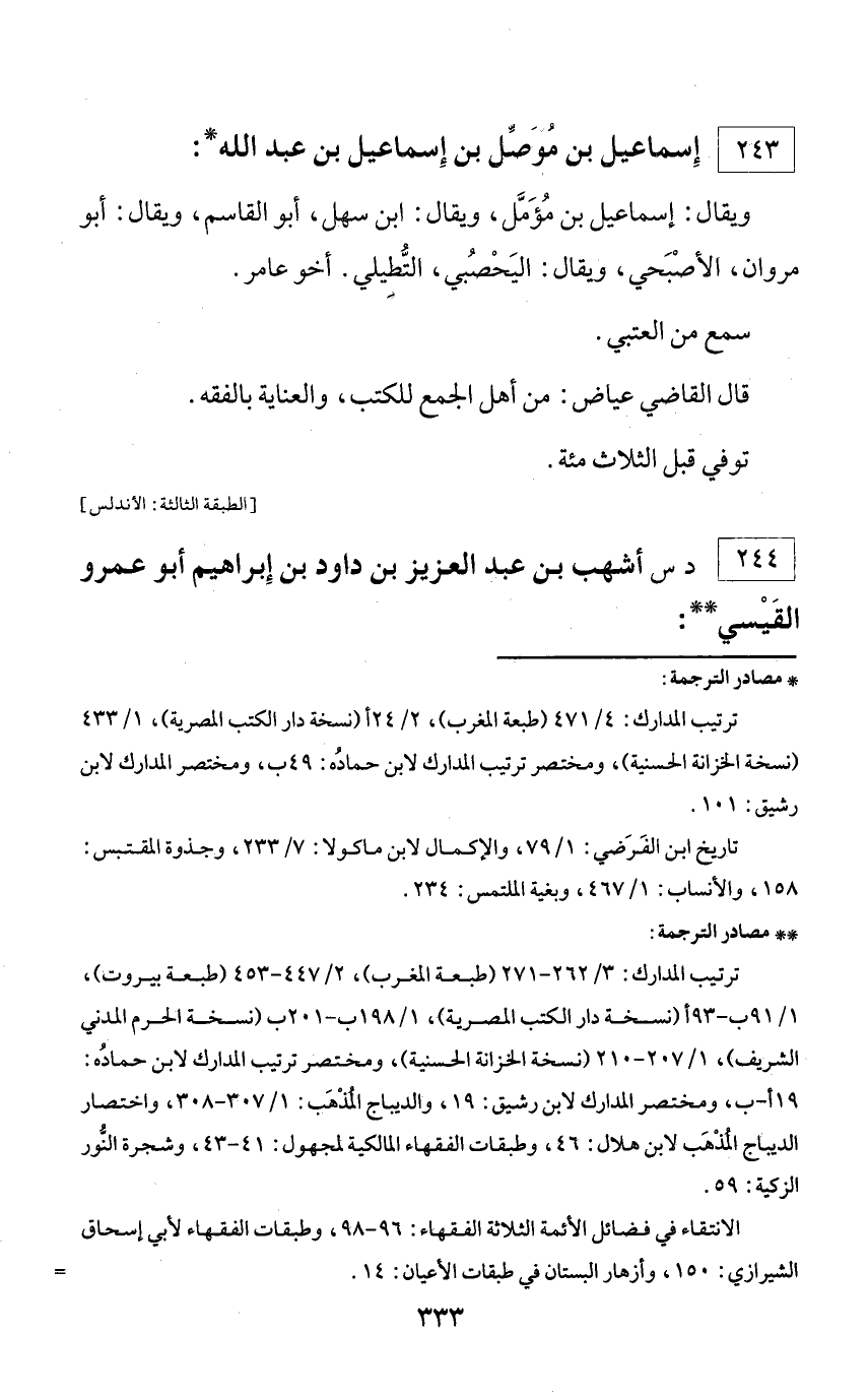 ** مصادر الترجمة: ترتيب المدارك: 3/ 262 - 271 (طبعة المغرب)، 2/ 447 - 453 (طبعة بيروت)، 1/ 91 ب - 93 أ (نسخة دار الكتب المصرية)، 1/ 198 ب - 201 ب (نسخة الحرم المدني الشريف)، 1/ 207 - 210 (نسخة الخزانة الحسنية)، ومختصر ترتيب المدارك لابن حماده: 19 أ - ب، ومختصر المدارك لابن رشيق: 19، والديباج المذهب: 1/ 307 - 308، واختصار الديباج المذهب لابن هلال: 46، وطبقات الفقهاء المالكية لمجهول: 41 - 43، وشجرة النّور الزكية: 59. الانتقاء في فضائل الأئمة الثلاثة الفقهاء: 96 - 98، وطبقات الفقهاء لأبي إسحاق الشيرازي: 150، وأزهار البستان في طبقات الأعيان: 14. =