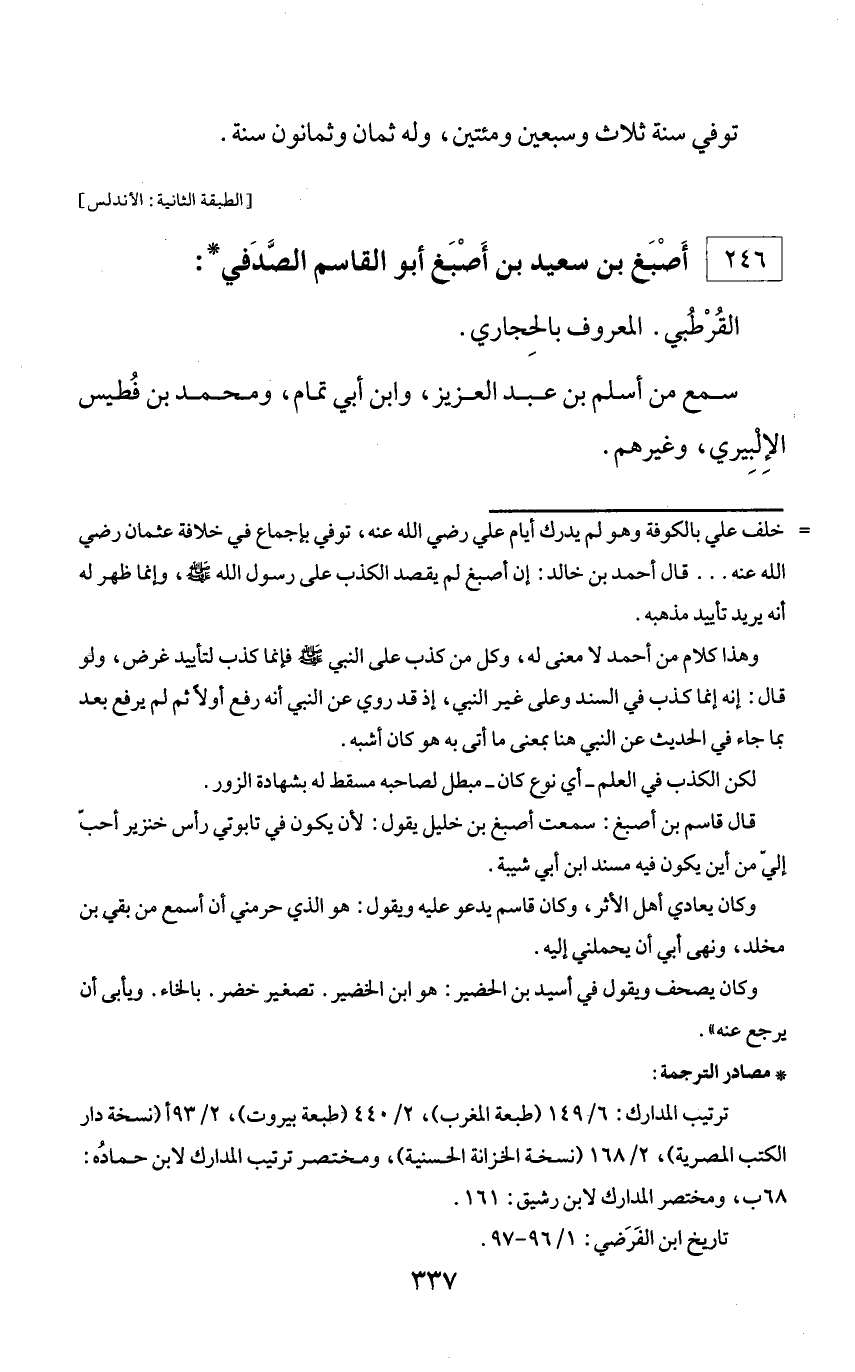 * مصادر الترجمة: ترتيب المدارك: 6/ 149 (طبعة المغرب)، 2/ 440 (طبعة بيروت)، 2/ 93 أ (نسخة دار الكتب المصرية)، 2/ 168 (نسخة الخزانة الحسنية)، ومختصر ترتيب المدارك لابن حماده: 68 ب، ومختصر المدارك لابن رشيق: 161. تاريخ ابن الفرضي: 1/ 96 - 97.