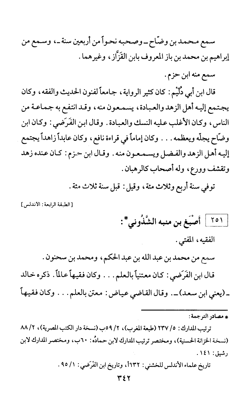 * مصادر الترجمة: ترتيب المدارك: 5/ 237 (طبعة المغرب)، 2/ 59 ب (نسخة دار الكتب المصرية)، 2/ 88 (نسخة الخزانة الحسنية)، ومختصر ترتيب المدارك لابن حماده: 60 ب، ومختصر المدارك لابن رشيق: 141. تاريخ علماء الأندلس للخشني: 132 أ، وتاريخ ابن الفرضي: 1/ 95.