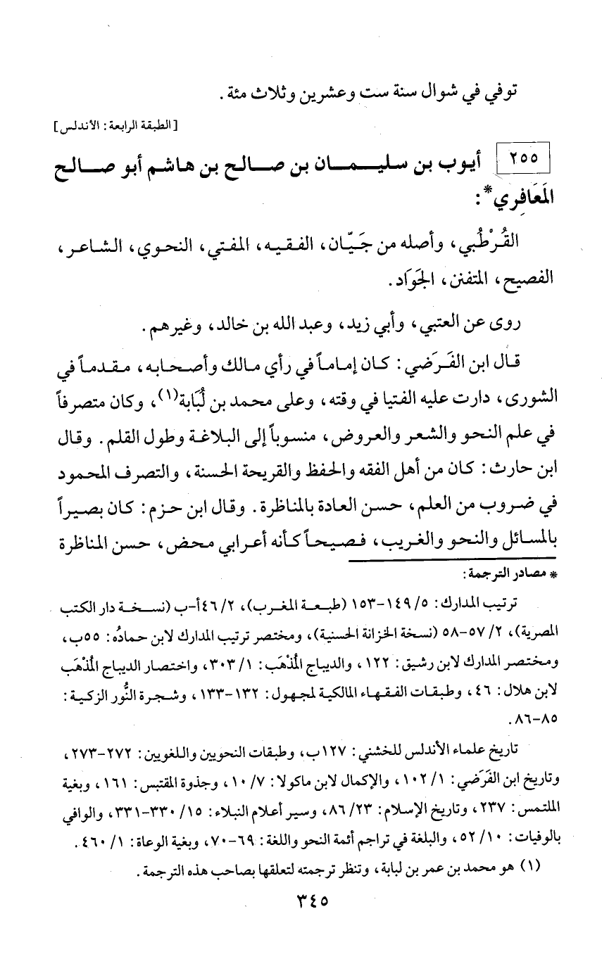 * مصادر الترجمة: ترتيب المدارك: 5/ 149 - 153 (طبعة المغرب)، 2/ 46 أ - ب (نسخة دار الكتب المصرية)، 2/ 57 - 58 (نسخة الخزانة الحسنية)، ومختصر ترتيب المدارك لابن حماده: 55 ب، ومختصر المدارك لابن رشيق: 122، والديباج المذهب: 1/ 303، واختصار الديباج المذهب لابن هلال: 46، وطبقات الفقهاء المالكية لمجهول: 132 - 133، وشجرة النّور الزكية: 85 - 86. تاريخ علماء الأندلس للخشني: 127 ب، وطبقات النحويين واللغويين: 272 - 273، وتاريخ ابن الفرضي: 1/ 102، والإكمال لابن ماكولا: 7/ 10، وجذوة المقتبس: 161، وبغية الملتمس: 237، وتاريخ الإسلام: 23/ 86، وسير أعلام النبلاء: 15/ 330 - 331، والوافي بالوفيات: 10/ 52، والبلغة في تراجم أئمة النحو واللغة: 69 - 70، وبغية الوعاة: 1/ 460.