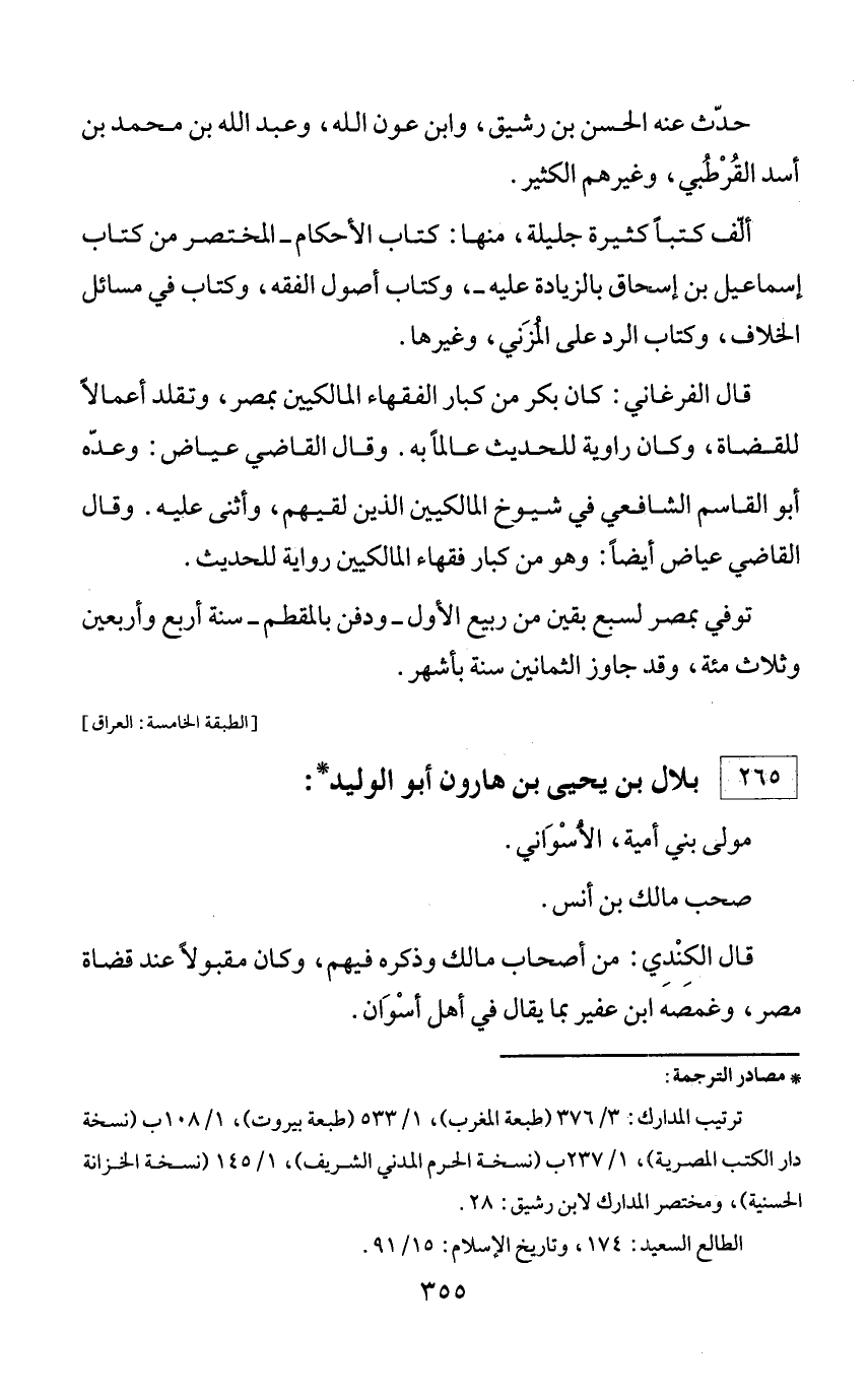 * مصادر الترجمة: ترتيب المدارك: 3/ 376 (طبعة المغرب)، 1/ 533 (طبعة بيروت)، 1/ 108 ب (نسخة دار الكتب المصرية)، 1/ 237 ب (نسخة الحرم المدني الشريف)، 1/ 145 (نسخة الخزانة الحسنية)، ومختصر المدارك لابن رشيق: 28. الطالع السعيد: 174، وتاريخ الإسلام: 15/ 91.