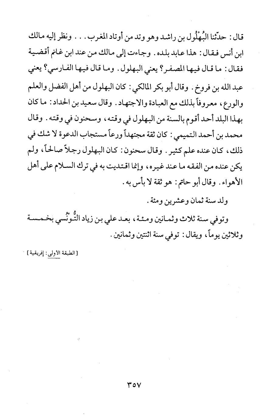 قال: حدّثنا البهلول بن راشد وهو وتد من أوتاد المغرب. . . ونظر إليه مالك ابن أنس فقال: هذا عابد بلده. وجاءت إلى مالك من عند ابن غانم أقضية فقال: ما قال فيها المصفر؟ يعني البهلول. وما قال فيها الفارسي؟ يعني عبد الله بن فروخ. وقال أبو بكر المالكي: كان البهلول من أهل الفضل والعلم والورع، معروفا بذلك مع العبادة والاجتهاد. وقال سعيد بن الحداد: ما كان بهذا البلد أحد أقوم بالسنة من البهلول في وقته، وسحنون في وقته. وقال محمد بن أحمد التميمي: كان ثقة مجتهدا ورعا مستجاب الدعوة لا شك في ذلك، كان عنده علم كثير. وقال سحنون: كان البهلول رجلا صالحا، ولم يكن عنده من الفقه ما عند غيره، وإنما اقتديت به في ترك السلام على أهل الأهواء. وقال أبو حاتم: هو ثقة لا بأس به.