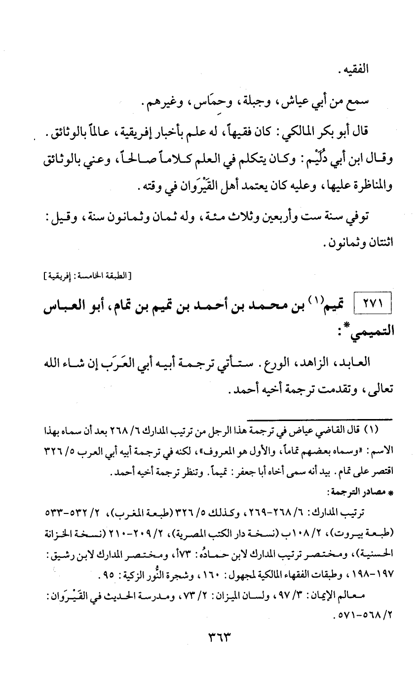 * مصادر الترجمة: ترتيب المدارك: 6/ 268 - 269، وكذلك 5/ 326 (طبعة المغرب)، 2/ 532 - 533 (طبعة بيروت)، 2/ 108 ب (نسخة دار الكتب المصرية)، 2/ 209 - 210 (نسخة الخزانة الحسنية)، ومختصر ترتيب المدارك لابن حماده: 73 أ، ومختصر المدارك لابن رشيق: 197 - 198، وطبقات الفقهاء المالكية لمجهول: 160، وشجرة النّور الزكية: 95. معالم الإيمان: 3/ 97، ولسان الميزان: 2/ 73، ومدرسة الحديث في القيروان: 2/ 568 - 571.