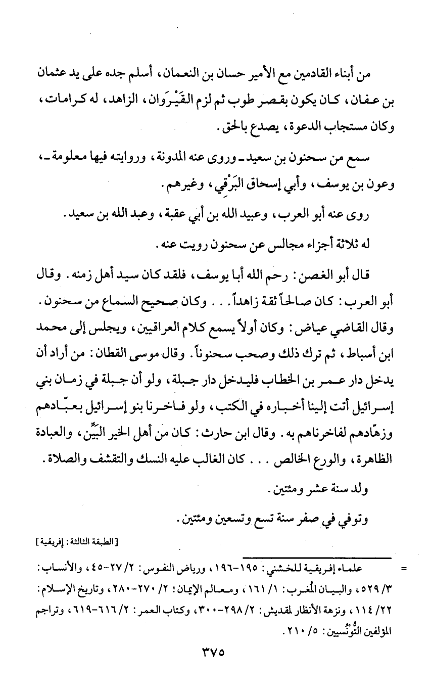 = علماء إفريقية للخشني: 195 - 196، ورياض النفوس: 2/ 27 - 45، والأنساب: 3/ 529، والبيان المغرب: 1/ 161، ومعالم الإيمان: 2/ 270 - 280، وتاريخ الإسلام: 22/ 114، ونزهة الأنظار لمقديش: 2/ 298 - 300، وكتاب العمر: 2/ 616 - 619، وتراجم المؤلفين التّونسيين: 5/ 210.