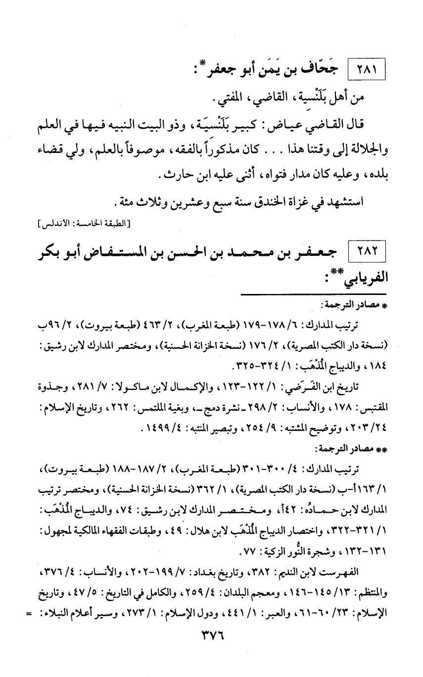 ** مصادر الترجمة: ترتيب المدارك: 4/ 300 - 301 (طبعة المغرب)، 2/ 187 - 188 (طبعة بيروت)، 1/ 163 أ - ب (نسخة دار الكتب المصرية)، 1/ 362 (نسخة الخزانة الحسنية)، ومختصر ترتيب المدارك لابن حماده: 42 أ، ومختصر المدارك لابن رشيق: 74، والديباج المذهب: 1/ 321 - 322، واختصار الديباج المذهب لابن هلال: 49، وطبقات الفقهاء المالكية لمجهول: 131 - 132، وشجرة النّور الزكية: 77. الفهرست لابن النديم: 382، وتاريخ بغداد: 7/ 199 - 202، والأنساب: 4/ 376، والمنتظم: 13/ 145 - 146، ومعجم البلدان: 4/ 259، والكامل في التاريخ: 5/ 47، وتاريخ الإسلام: 23/ 60 - 61، والعبر: 1/ 441، ودول الإسلام: 1/ 273، وسير أعلام النبلاء: =