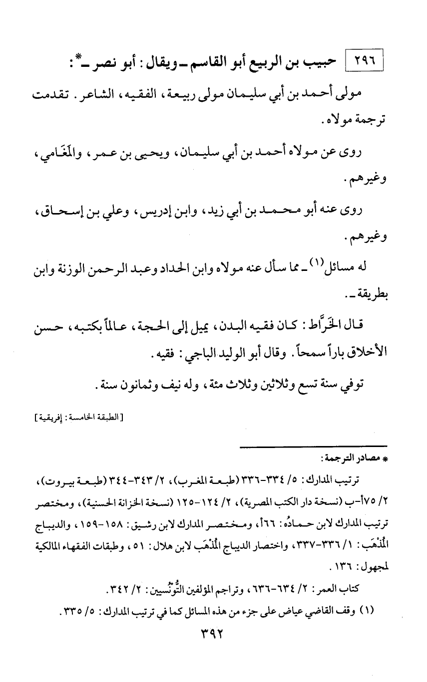 * مصادر الترجمة: ترتيب المدارك: 5/ 334 - 336 (طبعة المغرب)، 2/ 343 - 344 (طبعة بيروت)، 2/ 75 أ - ب (نسخة دار الكتب المصرية)، 2/ 124 - 125 (نسخة الخزانة الحسنية)، ومختصر ترتيب المدارك لابن حماده: 66 أ، ومختصر المدارك لابن رشيق: 158 - 159، والديباج المذهب: 1/ 336 - 337، واختصار الديباج المذهب لابن هلال: 51، وطبقات الفقهاء المالكية لمجهول: 136. كتاب العمر: 2/ 634 - 636، وتراجم المؤلفين التّونسيين: 2/ 342.