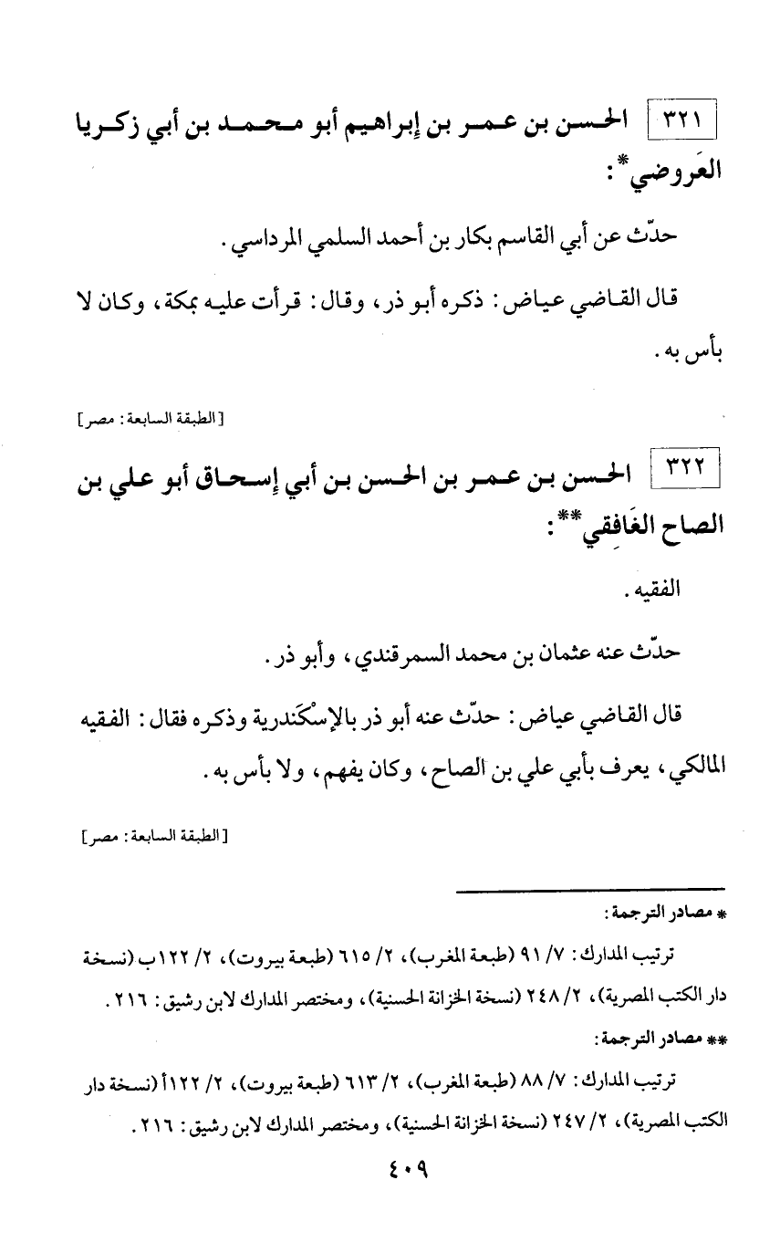 * مصادر الترجمة: ترتيب المدارك: 7/ 91 (طبعة المغرب)، 2/ 615 (طبعة بيروت)، 2/ 122 ب (نسخة دار الكتب المصرية)، 2/ 248 (نسخة الخزانة الحسنية)، ومختصر المدارك لابن رشيق: 216.