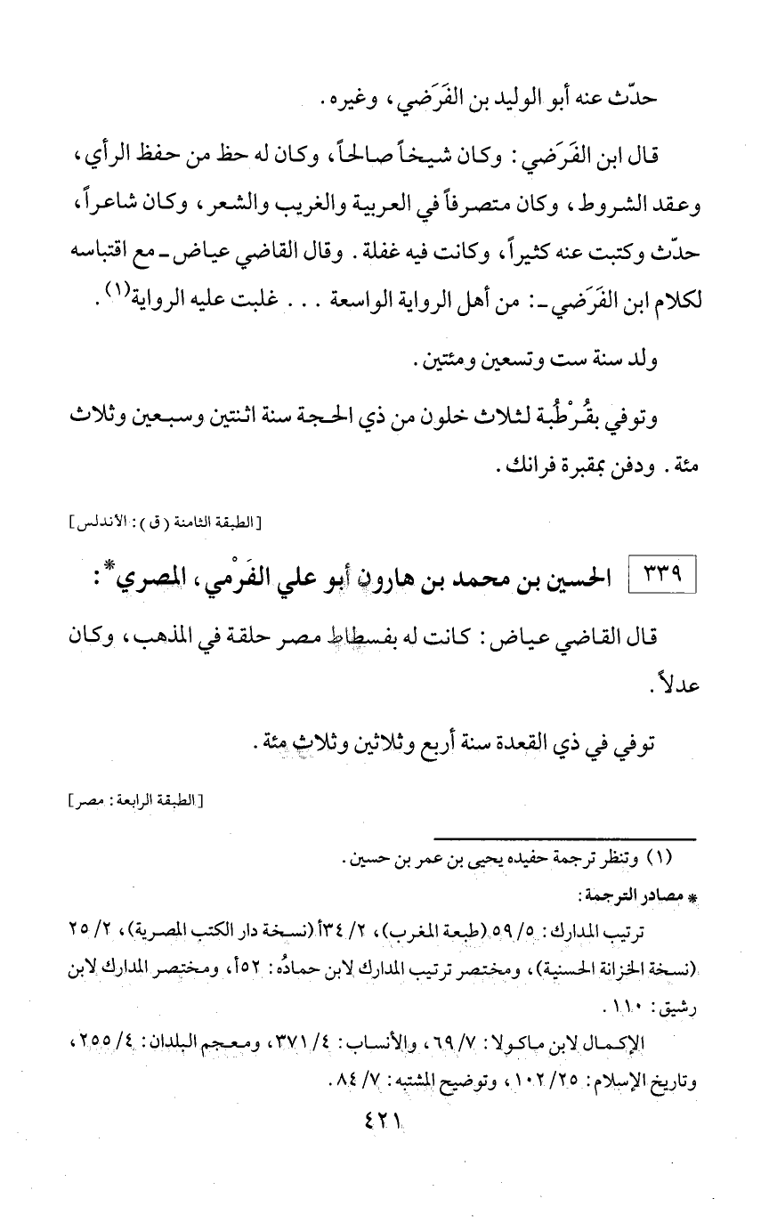 * مصادر الترجمة: ترتيب المدارك: 5/ 59 (طبعة المغرب)، 2/ 34 أ (نسخة دار الكتب المصرية)، 2/ 25 (نسخة الخزانة الحسنية)، ومختصر ترتيب المدارك لابن حماده: 52 أ، ومختصر المدارك لابن رشيق: 110. الإكمال لابن ماكولا: 7/ 69، والأنساب: 4/ 371، ومعجم البلدان: 4/ 255، وتاريخ الإسلام: 25/ 102، وتوضيح المشتبه: 7/ 84.