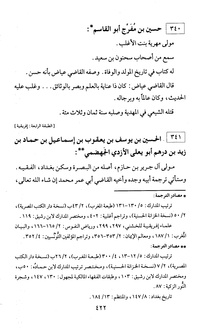 ** مصادر الترجمة: ترتيب المدارك: 5/ 12 - 13، 4/ 300 (طبعة المغرب)، 2/ 26 ب (نسخة دار الكتب المصرية)، 2/ 7 (نسخة الخزانة الحسنية)، ومختصر ترتيب المدارك لابن حماده: 50 ب، ومختصر المدارك لابن رشيق: 103، وطبقات الفقهاء المالكية لمجهول: 130، 147، وشجرة النّور الزكية: 87. تاريخ بغداد: 8/ 147، والمنتظم: 13/ 184.