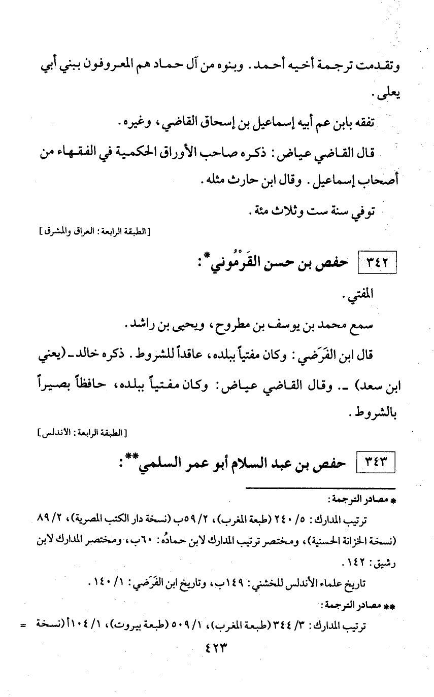 * مصادر الترجمة: ترتيب المدارك: 5/ 240 (طبعة المغرب)، 2/ 59 ب (نسخة دار الكتب المصرية)، 2/ 89 (نسخة الخزانة الحسنية)، ومختصر ترتيب المدارك لابن حماده: 60 ب، ومختصر المدارك لابن رشيق: 142. تاريخ علماء الأندلس للخشني: 149 ب، وتاريخ ابن الفرضي: 1/ 140.