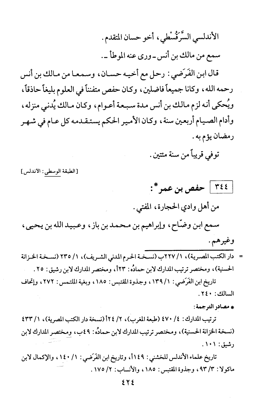 = دار الكتب المصرية)، 1/ 227 ب (نسخة الحرم المدني الشريف)، 1/ 235 (نسخة الخزانة الحسنية)، ومختصر ترتيب المدارك لابن حماده: 23 أ، ومختصر المدارك لابن رشيق: 25. تاريخ ابن الفرضي: 1/ 139، وجذوة المقتبس: 185، وبغية الملتمس: 272، وإتحاف السالك: 240.