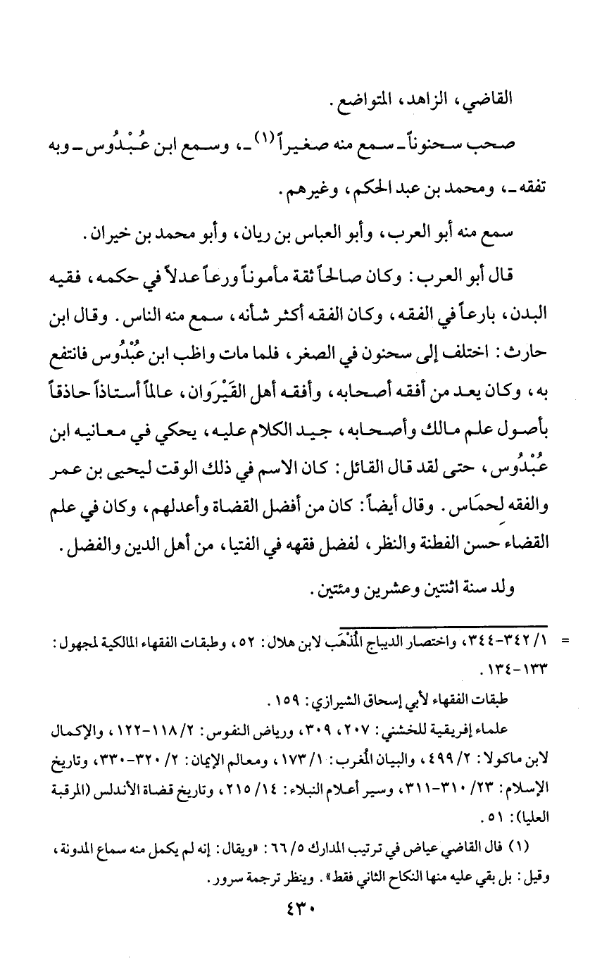 = 1/ 342 - 344، واختصار الديباج المذهب لابن هلال: 52، وطبقات الفقهاء المالكية لمجهول: 133 - 134. طبقات الفقهاء لأبي إسحاق الشيرازي: 159. علماء إفريقية للخشني: 207، 309، ورياض النفوس: 2/ 118 - 122، والإكمال لابن ماكولا: 2/ 499، والبيان المغرب: 1/ 173، ومعالم الإيمان: 2/ 320 - 330، وتاريخ الإسلام: 23/ 310 - 311، وسير أعلام النبلاء: 14/ 215، وتاريخ قضاة الأندلس (المرقبة العليا): 51.