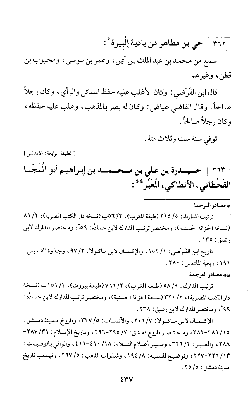 * مصادر الترجمة: ترتيب المدارك: 5/ 215 (طبعة المغرب)، 2/ 56 ب (نسخة دار الكتب المصرية)، 2/ 81 (نسخة الخزانة الحسنية)، ومختصر ترتيب المدارك لابن حماده: 59 أ، ومختصر المدارك لابن رشيق: 135. تاريخ ابن الفرضي: 1/ 152، والإكمال لابن ماكولا: 2/ 97، وجذوة المقتبس: 191، وبغية الملتمس: 280.