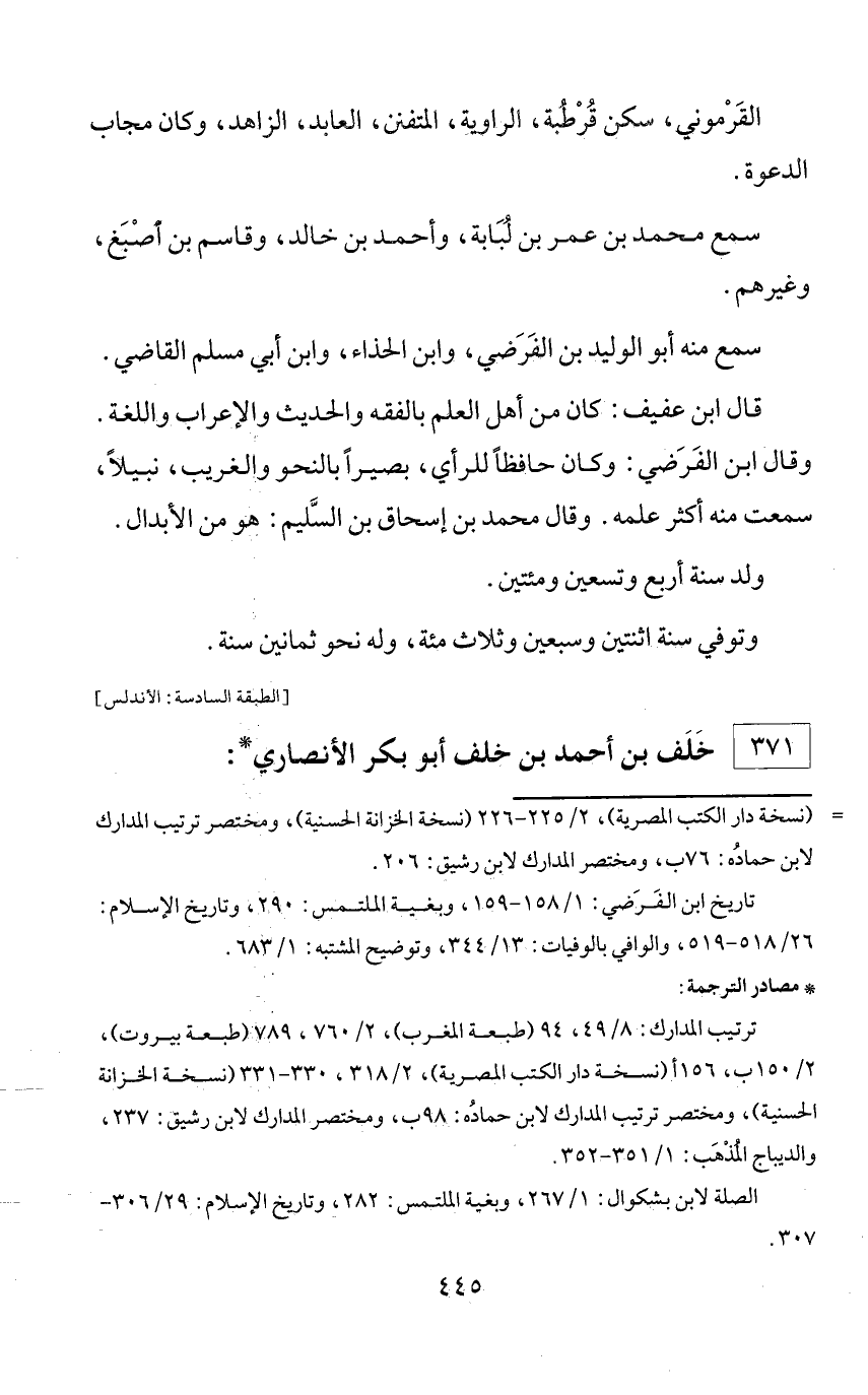 = (نسخة دار الكتب المصرية)، 2/ 225 - 226 (نسخة الخزانة الحسنية)، ومختصر ترتيب المدارك لابن حماده: 76 ب، ومختصر المدارك لابن رشيق: 206. تاريخ ابن الفرضي: 1/ 158 - 159، وبغية الملتمس: 290، وتاريخ الإسلام: 26/ 518 - 519، والوافي بالوفيات: 13/ 344، وتوضيح المشتبه: 1/ 683.