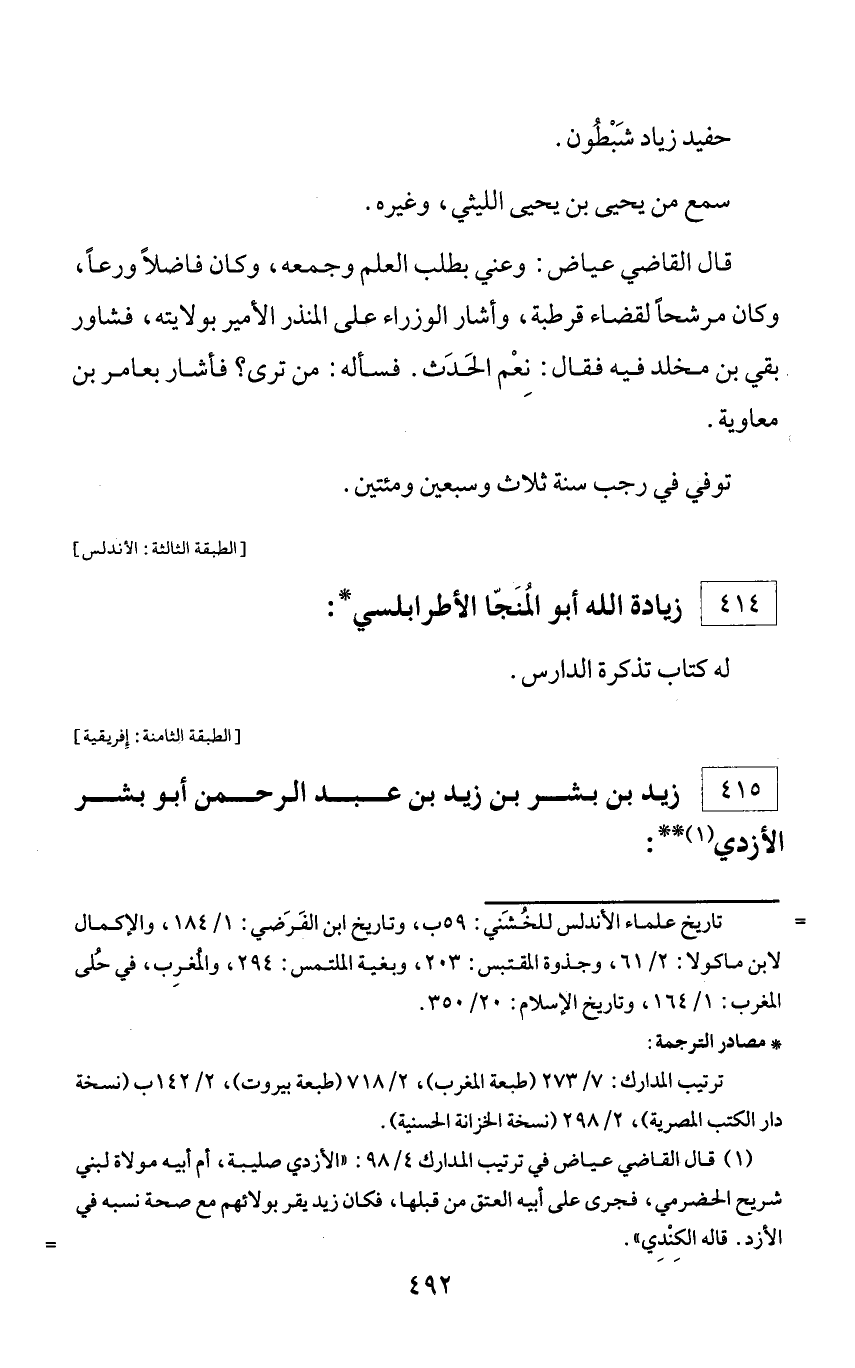 (¬1) قال القاضي عياض في ترتيب المدارك 4/ 98: «الأزدي صليبة، أم أبيه مولاة لبني شريح الحضرمي، فجرى على أبيه العتق من قبلها، فكان زيد يقر بولائهم مع صحة نسبه في الأزد. قاله الكندي».