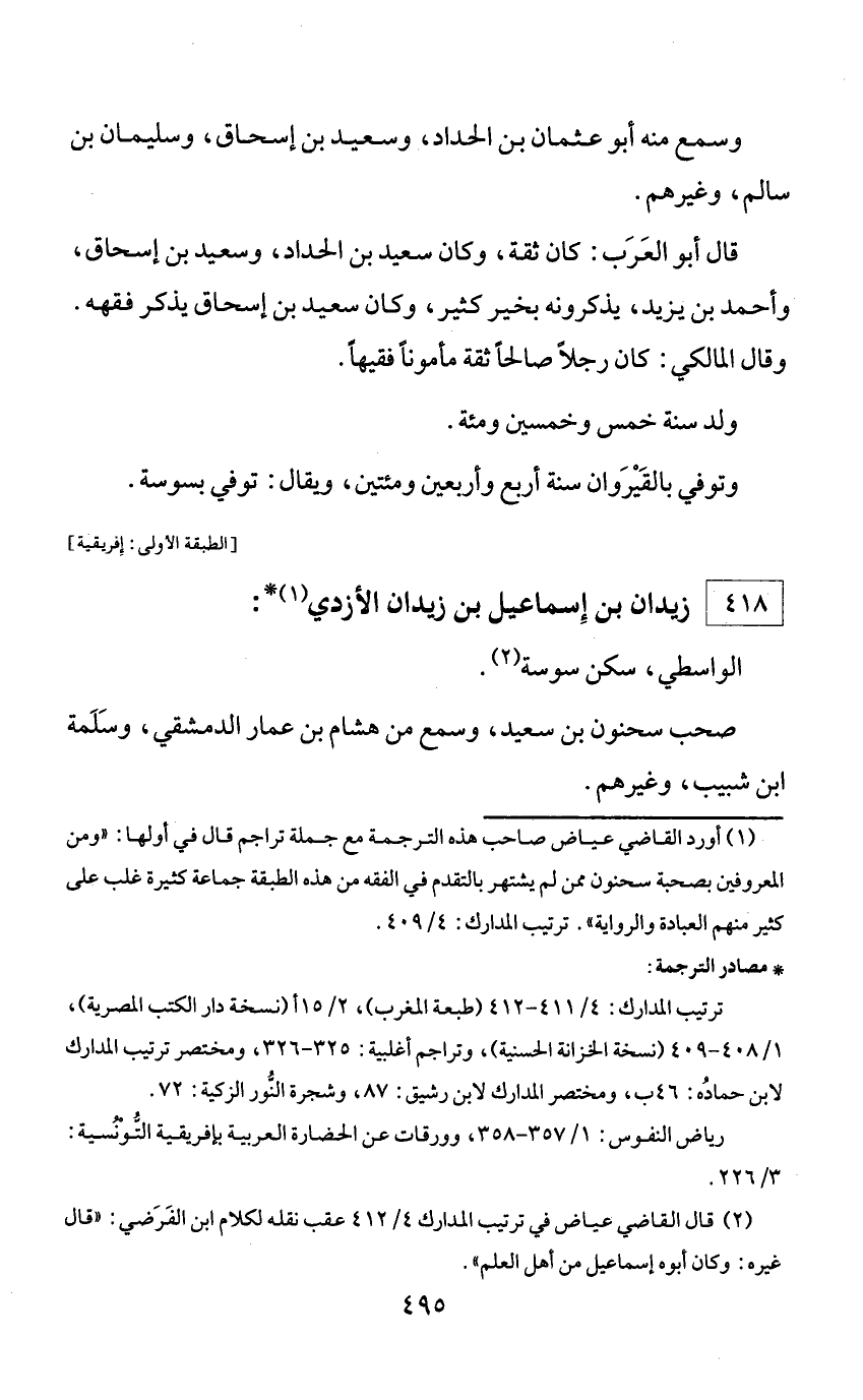 (¬1) أورد القاضي عياض صاحب هذه الترجمة مع جملة تراجم قال في أولها: «ومن المعروفين بصحبة سحنون ممن لم يشتهر بالتقدم في الفقه من هذه الطبقة جماعة كثيرة غلب على كثير منهم العبادة والرواية». ترتيب المدارك: 4/ 409.