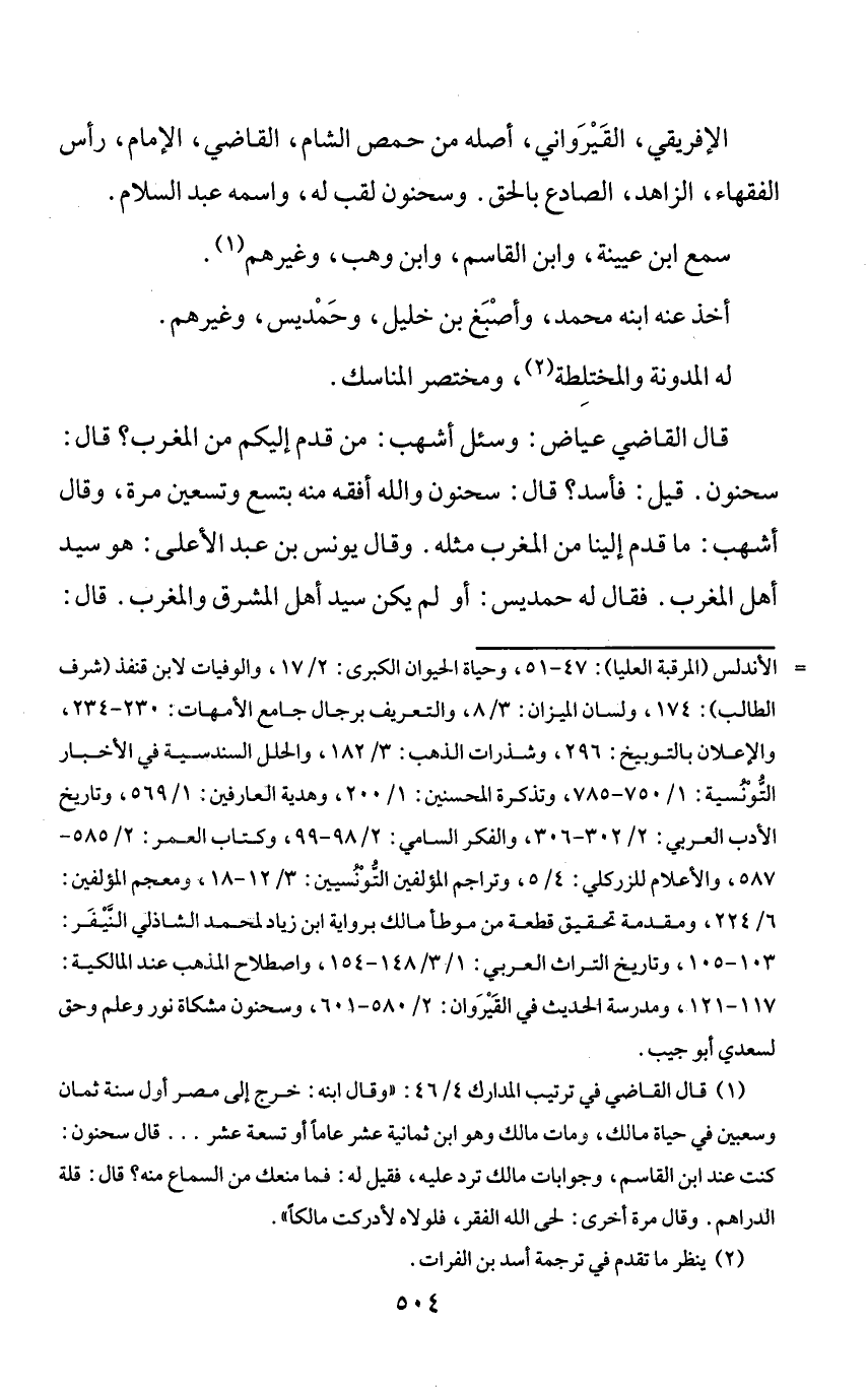 الإفريقي، القيرواني، أصله من حمص الشام، القاضي، الإمام، رأس الفقهاء، الزاهد، الصادع بالحق. وسحنون لقب له، واسمه عبد السلام.