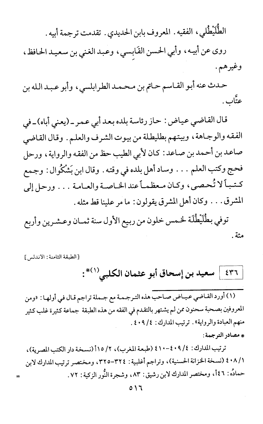 (¬1) أورد القاضي عياض صاحب هذه الترجمة مع جملة تراجم قال في أولها: «ومن المعروفين بصحبة سحنون ممن لم يشتهر بالتقدم في الفقه من هذه الطبقة جماعة كثيرة غلب كثير منهم العبادة والرواية». ترتيب المدارك: 4/ 409.