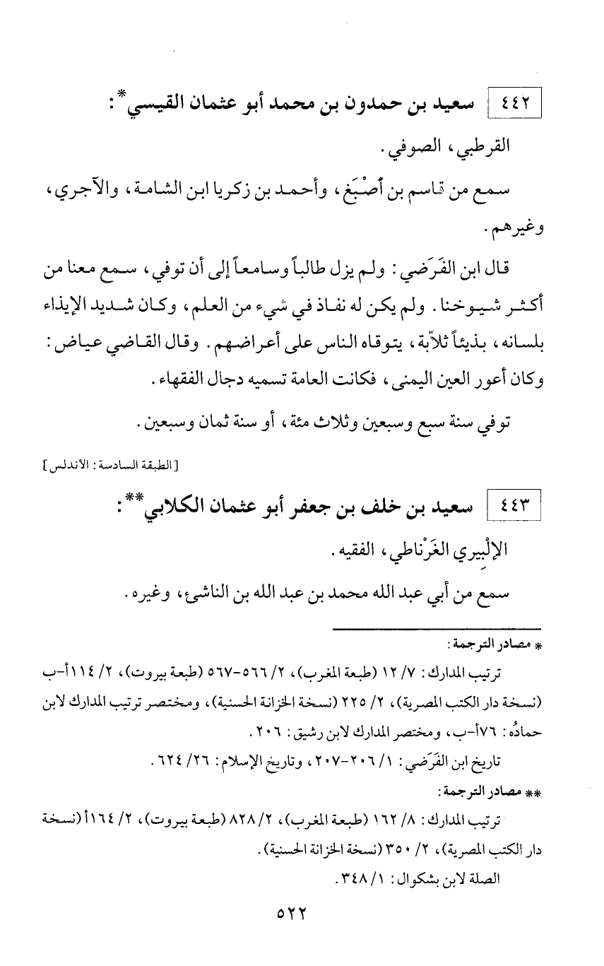 * مصادر الترجمة: ترتيب المدارك: 7/ 12 (طبعة المغرب)، 2/ 566 - 567 (طبعة بيروت)، 2/ 114 أ - ب (نسخة دار الكتب المصرية)، 2/ 225 (نسخة الخزانة الحسنية)، ومختصر ترتيب المدارك لابن حماده: 76 أ - ب، ومختصر المدارك لابن رشيق: 206. تاريخ ابن الفرضي: 1/ 206 - 207، وتاريخ الإسلام: 26/ 624.