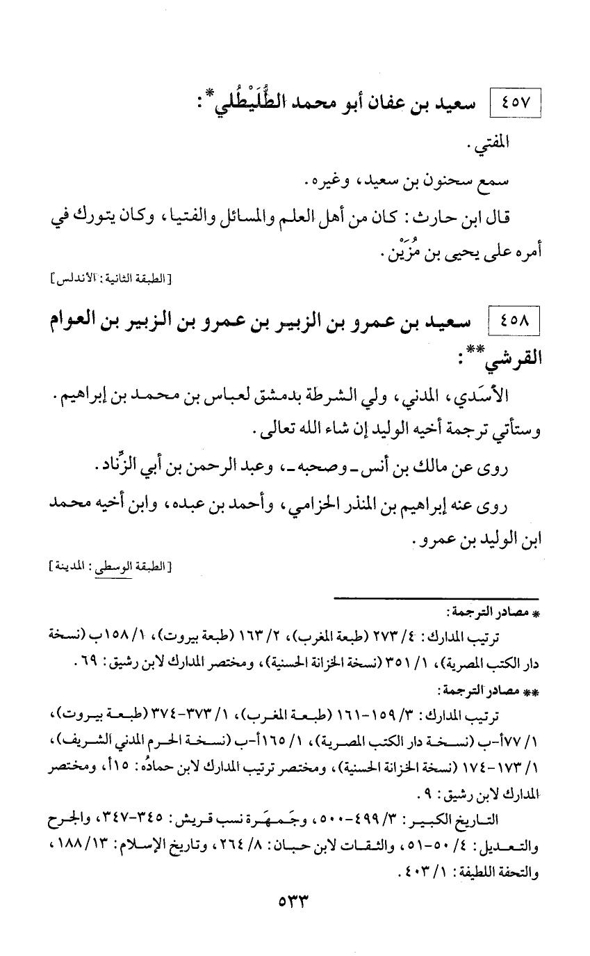 ** مصادر الترجمة: ترتيب المدارك: 3/ 159 - 161 (طبعة المغرب)، 1/ 373 - 374 (طبعة بيروت)، 1/ 77 أ - ب (نسخة دار الكتب المصرية)، 1/ 165 أ - ب (نسخة الحرم المدني الشريف)، 1/ 173 - 174 (نسخة الخزانة الحسنية)، ومختصر ترتيب المدارك لابن حماده: 15 أ، ومختصر المدارك لابن رشيق: 9. التاريخ الكبير: 3/ 499 - 500، وجمهرة نسب قريش: 345 - 347، والجرح والتعديل: 4/ 50 - 51، والثقات لابن حبان: 8/ 264، وتاريخ الإسلام: 13/ 188، والتحفة اللطيفة: 1/ 403.