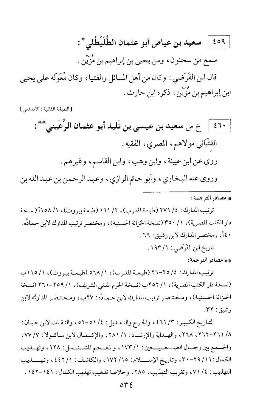 ** مصادر الترجمة: ترتيب المدارك: 4/ 25 - 26 (طبعة المغرب)، 1/ 568 (طبعة بيروت)، 1/ 115 ب (نسخة دار الكتب المصرية)، 1/ 252 ب (نسخة الحرم المدني الشريف)، 1/ 259 - 260 (نسخة الخزانة الحسنية)، ومختصر ترتيب المدارك لابن حماده: 27 ب، ومختصر المدارك لابن رشيق: 32. التاريخ الكبير: 3/ 461، والجرح والتعديل: 4/ 51 - 52، والثقات لابن حبان: 8/ 261 - 262، 268، والهداية والإرشاد: 1/ 281، والإكمال لابن ماكولا: 7/ 77، والجمع بين رجال الصحيحين: 1/ 173، والمعجم المشتمل: 128، وتهذيب الكمال: 11/ 29 - 30، وتاريخ الإسلام: 15/ 172، والكاشف: 1/ 442، وتهذيب التهذيب: 4/ 71، وتقريب التهذيب: 285، وخلاصة تذهيب تهذيب الكمال: 141 - 142.