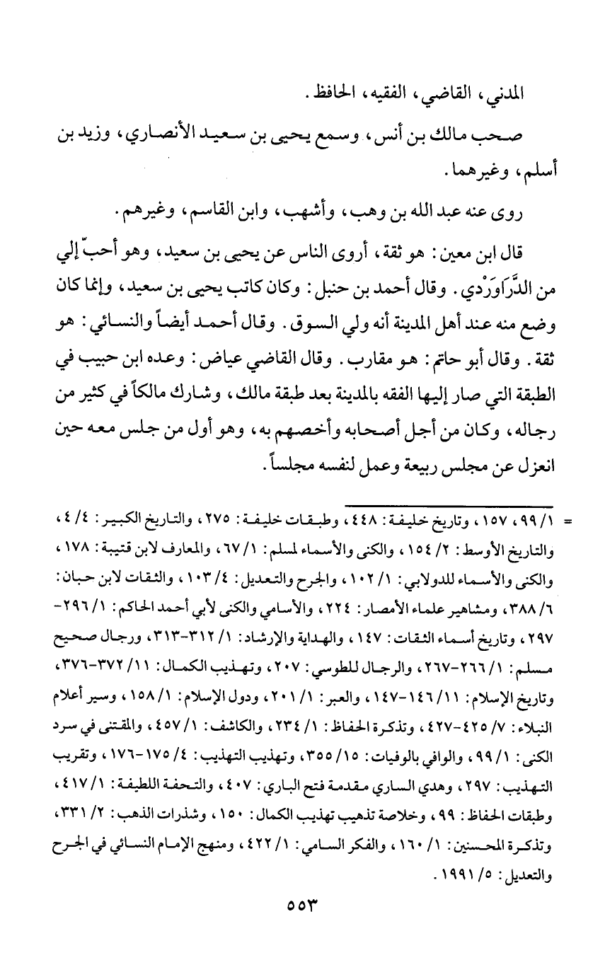 = 1/ 99، 157، وتاريخ خليفة: 448، وطبقات خليفة: 275، والتاريخ الكبير: 4/ 4، والتاريخ الأوسط: 2/ 154، والكنى والأسماء لمسلم: 1/ 67، والمعارف لابن قتيبة: 178، والكنى والأسماء للدولابي: 1/ 102، والجرح والتعديل: 4/ 103، والثقات لابن حبان: 6/ 388، ومشاهير علماء الأمصار: 224، والأسامي والكنى لأبي أحمد الحاكم: 1/ 296 - 297، وتاريخ أسماء الثقات: 147، والهداية والإرشاد: 1/ 312 - 313، ورجال صحيح مسلم: 1/ 266 - 267، والرجال للطوسي: 207، وتهذيب الكمال: 11/ 372 - 376، وتاريخ الإسلام: 11/ 146 - 147، والعبر: 1/ 201، ودول الإسلام: 1/ 158، وسير أعلام النبلاء: 7/ 425 - 427، وتذكرة الحفاظ: 1/ 234، والكاشف: 1/ 457، والمقتنى في سرد الكنى: 1/ 99، والوافي بالوفيات: 15/ 355، وتهذيب التهذيب: 4/ 175 - 176، وتقريب التهذيب: 297، وهدي الساري مقدمة فتح الباري: 407، والتحفة اللطيفة: 1/ 417، وطبقات الحفاظ: 99، وخلاصة تذهيب تهذيب الكمال: 150، وشذرات الذهب: 2/ 331، وتذكرة المحسنين: 1/ 160، والفكر السامي: 1/ 422، ومنهج الإمام النسائي في الجرح والتعديل: 5/ 1991.