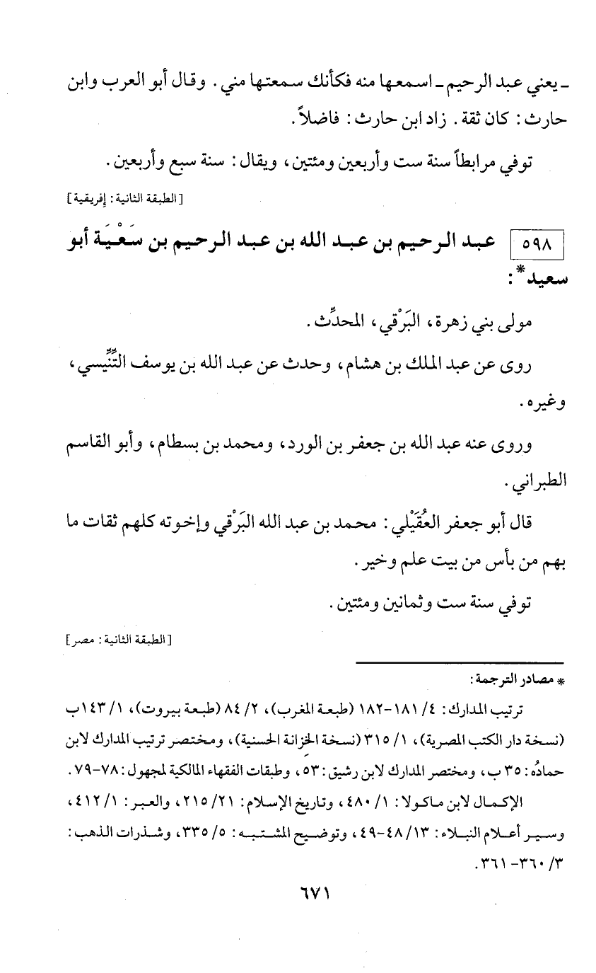* مصادر الترجمة: ترتيب المدارك: 4/ 181 - 182 (طبعة المغرب)، 2/ 84 (طبعة بيروت)، 1/ 143 ب (نسخة دار الكتب المصرية)، 1/ 315 (نسخة الخزانة الحسنية)، ومختصر ترتيب المدارك لابن حماده: 35 ب، ومختصر المدارك لابن رشيق: 53، وطبقات الفقهاء المالكية لمجهول: 78 - 79. الإكمال لابن ماكولا: 1/ 480، وتاريخ الإسلام: 21/ 215، والعبر: 1/ 412، وسير أعلام النبلاء: 13/ 48 - 49، وتوضيح المشتبه: 5/ 335، وشذرات الذهب: 3/ 360 - 361.