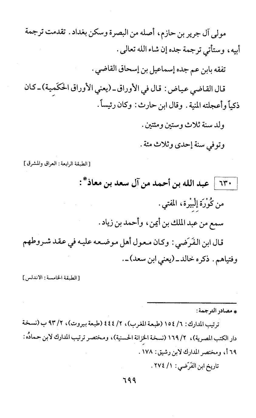 * مصادر الترجمة: ترتيب المدارك: 6/ 154 (طبعة المغرب)، 2/ 444 (طبعة بيروت)، 2/ 93 ب (نسخة دار الكتب المصرية)، 2/ 169 (نسخة الخزانة الحسنية)، ومختصر ترتيب المدارك لابن حماده: 69 أ، ومختصر المدارك لابن رشيق: 178. تاريخ ابن الفرضي: 1/ 274.