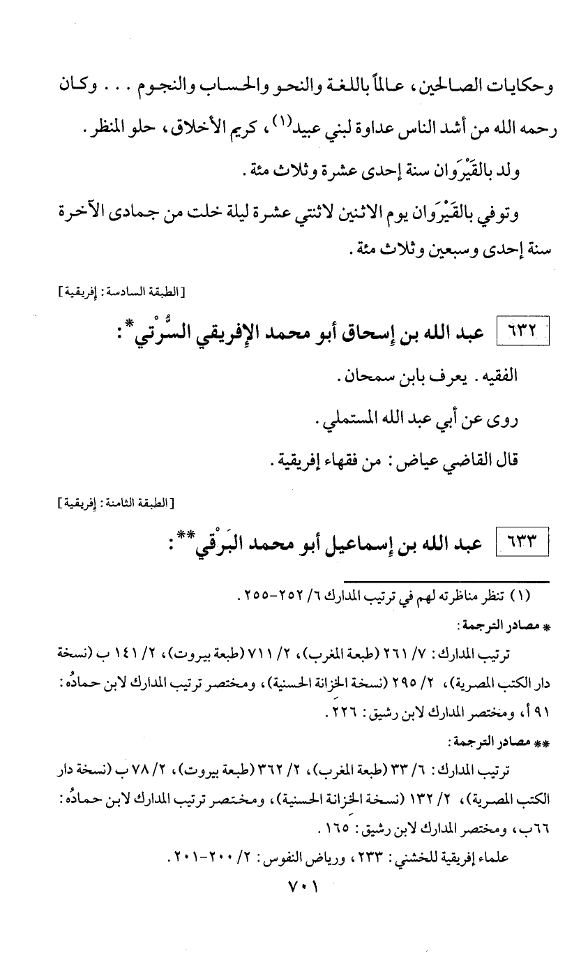 ** مصادر الترجمة: ترتيب المدارك: 6/ 33 (طبعة المغرب)، 2/ 362 (طبعة بيروت)، 2/ 78 ب (نسخة دار الكتب المصرية)، 2/ 132 (نسخة الخزانة الحسنية)، ومختصر ترتيب المدارك لابن حماده: 66 ب، ومختصر المدارك لابن رشيق: 165. علماء إفريقية للخشني: 233، ورياض النفوس: 2/ 200 - 201.