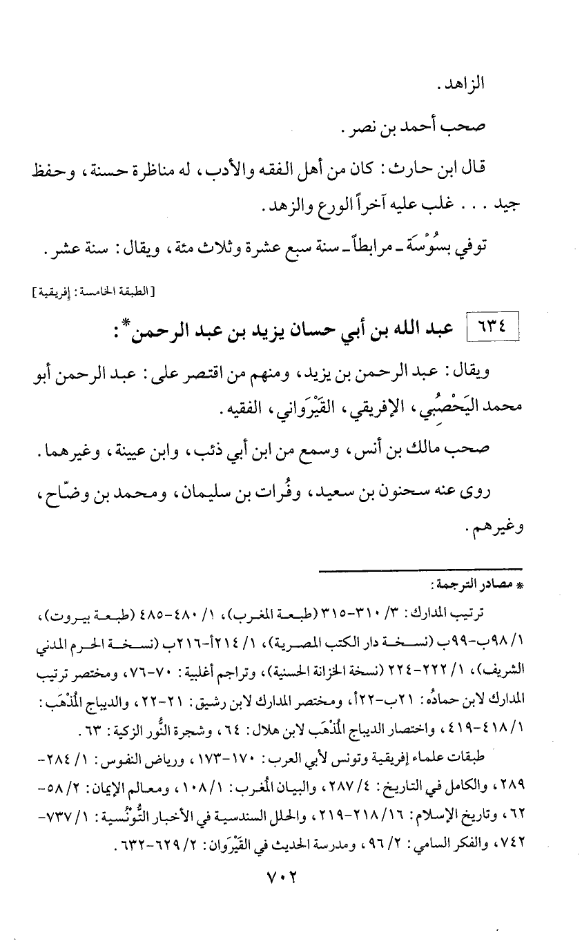 * مصادر الترجمة: ترتيب المدارك: 3/ 310 - 315 (طبعة المغرب)، 1/ 480 - 485 (طبعة بيروت)، 1/ 98 ب - 99 ب (نسخة دار الكتب المصرية)، 1/ 214 أ - 216 ب (نسخة الحرم المدني الشريف)، 1/ 222 - 224 (نسخة الخزانة الحسنية)، وتراجم أغلبية: 70 - 76، ومختصر ترتيب المدارك لابن حماده: 21 ب - 22 أ، ومختصر المدارك لابن رشيق: 21 - 22، والديباج المذهب: 1/ 418 - 419، واختصار الديباج المذهب لابن هلال: 64، وشجرة النّور الزكية: 63. طبقات علماء إفريقية وتونس لأبي العرب: 170 - 173، ورياض النفوس: 1/ 284 - 289، والكامل في التاريخ: 4/ 287، والبيان المغرب: 1/ 108، ومعالم الإيمان: 2/ 58 - 62، وتاريخ الإسلام: 16/ 218 - 219، والحلل السندسية في الأخبار التّونسية: 1/ 737 - 742، والفكر السامي: 2/ 96، ومدرسة الحديث في القيروان: 2/ 629 - 632.