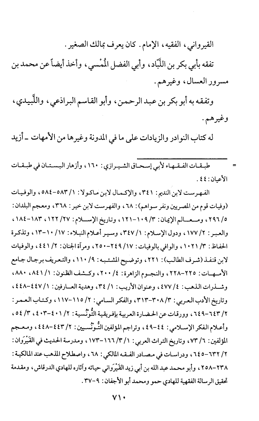= طبقات الفقهاء لأبي إسحاق الشيرازي: 160، وأزهار البستان في طبقات الأعيان: 44. الفهرست لابن النديم: 341، والإكمال لابن ماكولا: 1/ 583 - 584، والوفيات (وفيات قوم من المصريين ونفر سواهم): 68، والفهرست لابن خير: 368، ومعجم البلدان: 5/ 296، ومعالم الإيمان: 3/ 109 - 121، وتاريخ الإسلام: 27/ 122، 183 - 184، والعبر: 2/ 177، ودول الإسلام: 1/ 347، وسير أعلام النبلاء: 17/ 10 - 13، وتذكرة الحفاظ: 3/ 1021، والوافي بالوفيات: 17/ 249 - 250، ومرآة الجنان: 2/ 441، والوفيات لابن قنفذ (شرف الطالب): 221، وتوضيح المشتبه: 9/ 110، والتعريف برجال جامع الأمهات: 225 - 228، والنجوم الزاهرة: 4/ 200، وكشف الظنون: 1/ 841، 880، وشذرات الذهب: 4/ 477، وعنوان الأريب: 1/ 34، وهدية العارفين: 1/ 447 - 448، وتاريخ الأدب العربي: 3/ 308 - 313، والفكر السامي: 2/ 115 - 117، وكتاب العمر: 2/ 643 - 649، وورقات عن الحضارة العربية بإفريقية التّونسية: 2/ 401 - 403، 3/ 54، وأعلام الفكر الإسلامي: 44 - 49، وتراجم المؤلفين التّونسيين: 2/ 443 - 448، ومعجم المؤلفين: 6/ 73، وتاريخ التراث العربي: 1/ 3 / 166 - 173، ومدرسة الحديث في القيروان: 2/ 632 - 645، ودراسات في مصادر الفقه المالكي: 68، واصطلاح المذهب عند المالكية: 238 - 258، وأبو محمد عبد الله بن أبي زيد القيرواني حياته وآثاره للهادي الدرقاش، ومقدمة تحقيق الرسالة الفقهية للهادي حمو ومحمد أبو الأجفان: 9 - 37.