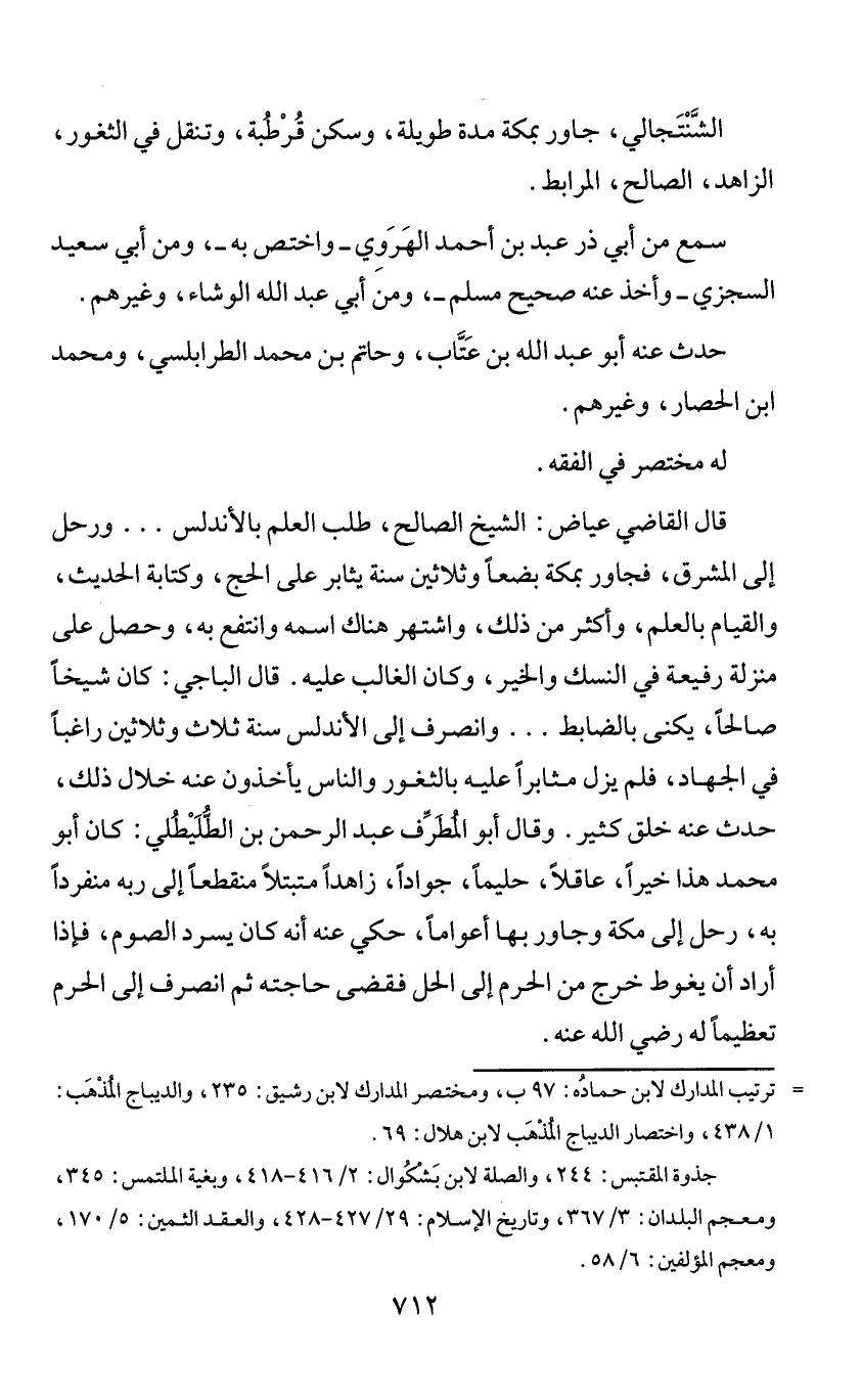 الشّنتجالي، جاور بمكة مدة طويلة، وسكن قرطبة، وتنقل في الثغور، الزاهد، الصالح، المرابط.