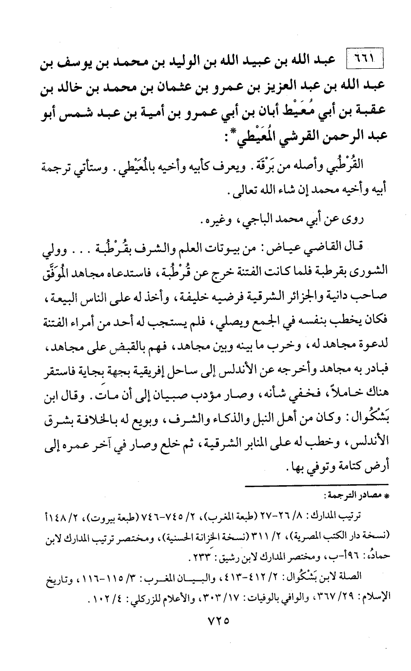 * مصادر الترجمة: ترتيب المدارك: 8/ 26 - 27 (طبعة المغرب)، 2/ 745 - 746 (طبعة بيروت)، 2/ 148 أ (نسخة دار الكتب المصرية)، 2/ 311 (نسخة الخزانة الحسنية)، ومختصر ترتيب المدارك لابن حماده: 96 أ - ب، ومختصر المدارك لابن رشيق: 233. الصلة لابن بشكوال: 2/ 412 - 413، والبيان المغرب: 3/ 115 - 116، وتاريخ الإسلام: 29/ 367، والوافي بالوفيات: 17/ 303، والأعلام للزركلي: 4/ 102.
