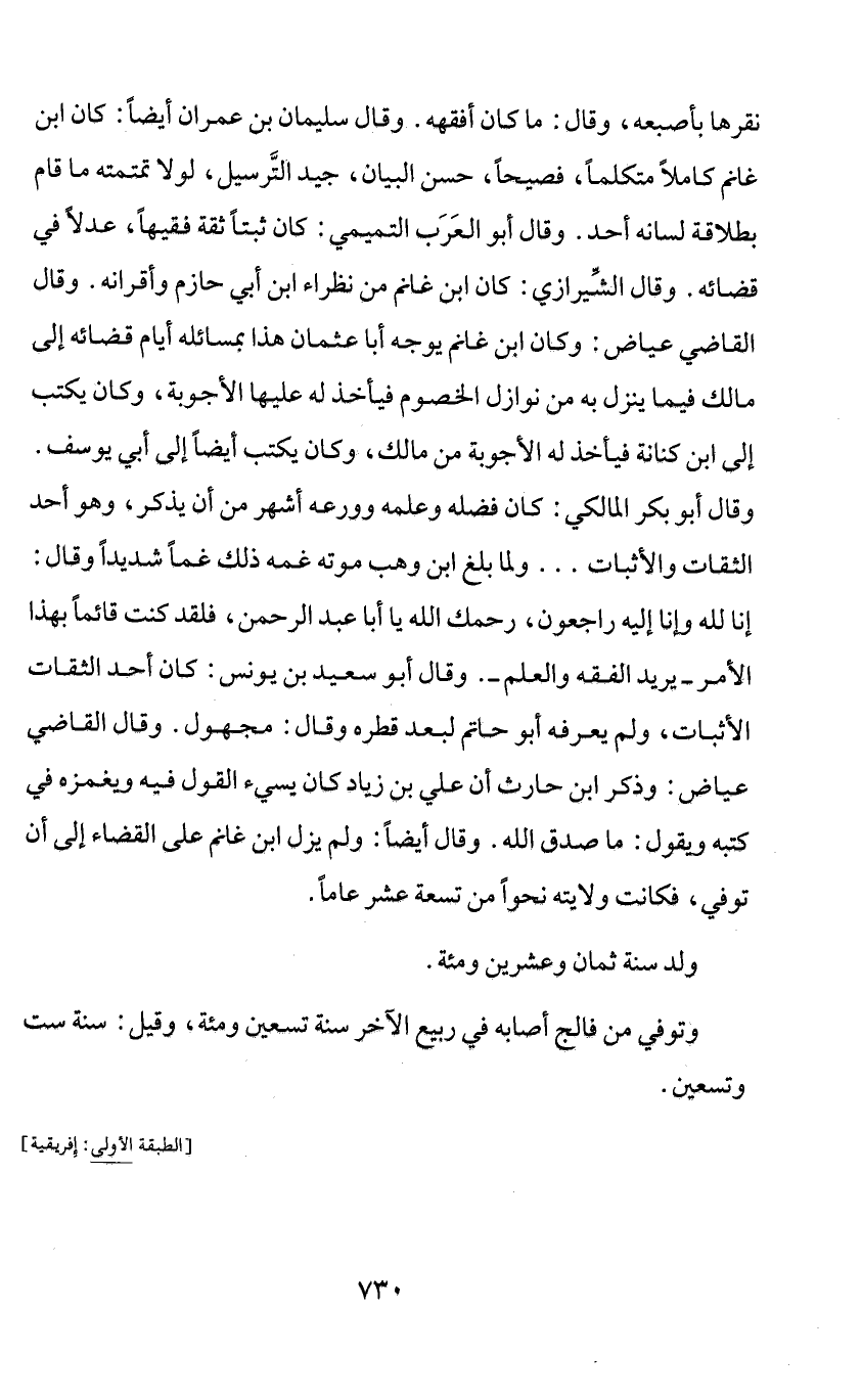 نقرها بأصبعه، وقال: ما كان أفقهه. وقال سليمان بن عمران أيضا: كان ابن غانم كاملا متكلما، فصيحا، حسن البيان، جيد التّرسيل، لولا تمتمته ما قام بطلاقة لسانه أحد. وقال أبو العرب التميمي: كان ثبتا ثقة فقيها، عدلا في قضائه. وقال الشّيرازي: كان ابن غانم من نظراء ابن أبي حازم وأقرانه. وقال القاضي عياض: وكان ابن غانم يوجه أبا عثمان هذا بمسائله أيام قضائه إلى مالك فيما ينزل به من نوازل الخصوم فيأخذ له عليها الأجوبة، وكان يكتب إلى ابن كنانة فيأخذ له الأجوبة من مالك، وكان يكتب أيضا إلى أبي يوسف.