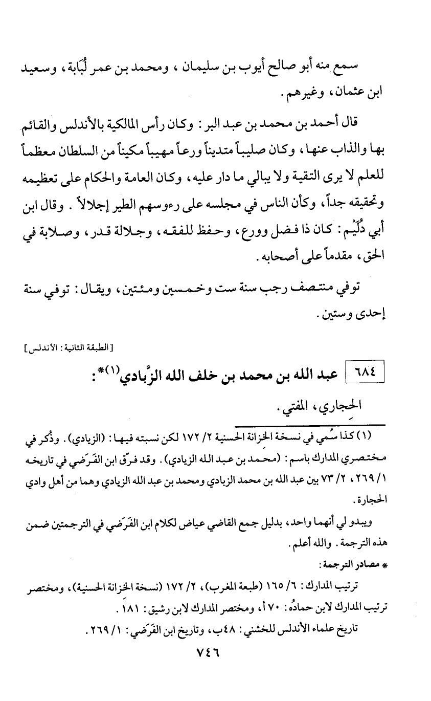 (¬1) كذا سمي في نسخة الخزانة الحسنية 2/ 172 لكن نسبته فيها: (الزيادي). وذكر في مختصري المدارك باسم: (محمد بن عبد الله الزيادي). وقد فرّق ابن الفرضي في تاريخه 1/ 269، 2/ 73 بين عبد الله بن محمد الزبادي ومحمد بن عبد الله الزيادي وهما من أهل وادي الحجارة. ويبدو لي أنهما واحد، بدليل جمع القاضي عياض لكلام ابن الفرضي في الترجمتين ضمن هذه الترجمة. والله أعلم.