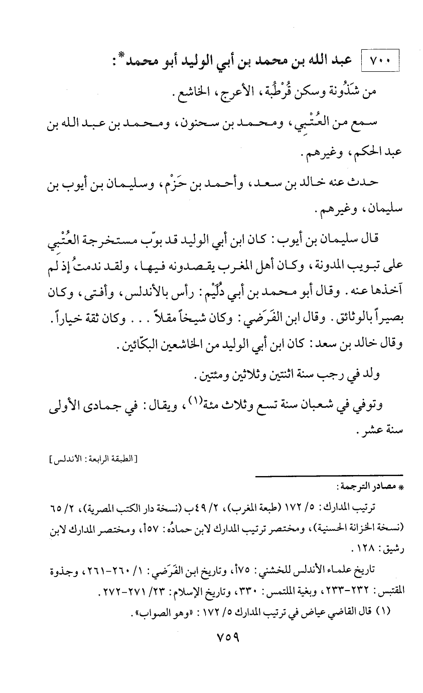 * مصادر الترجمة: ترتيب المدارك: 5/ 172 (طبعة المغرب)، 2/ 49 ب (نسخة دار الكتب المصرية)، 2/ 65 (نسخة الخزانة الحسنية)، ومختصر ترتيب المدارك لابن حماده: 57 أ، ومختصر المدارك لابن رشيق: 128. تاريخ علماء الأندلس للخشني: 75 أ، وتاريخ ابن الفرضي: 1/ 260 - 261، وجذوة المقتبس: 232 - 233، وبغية الملتمس: 330، وتاريخ الإسلام: 23/ 271 - 272.