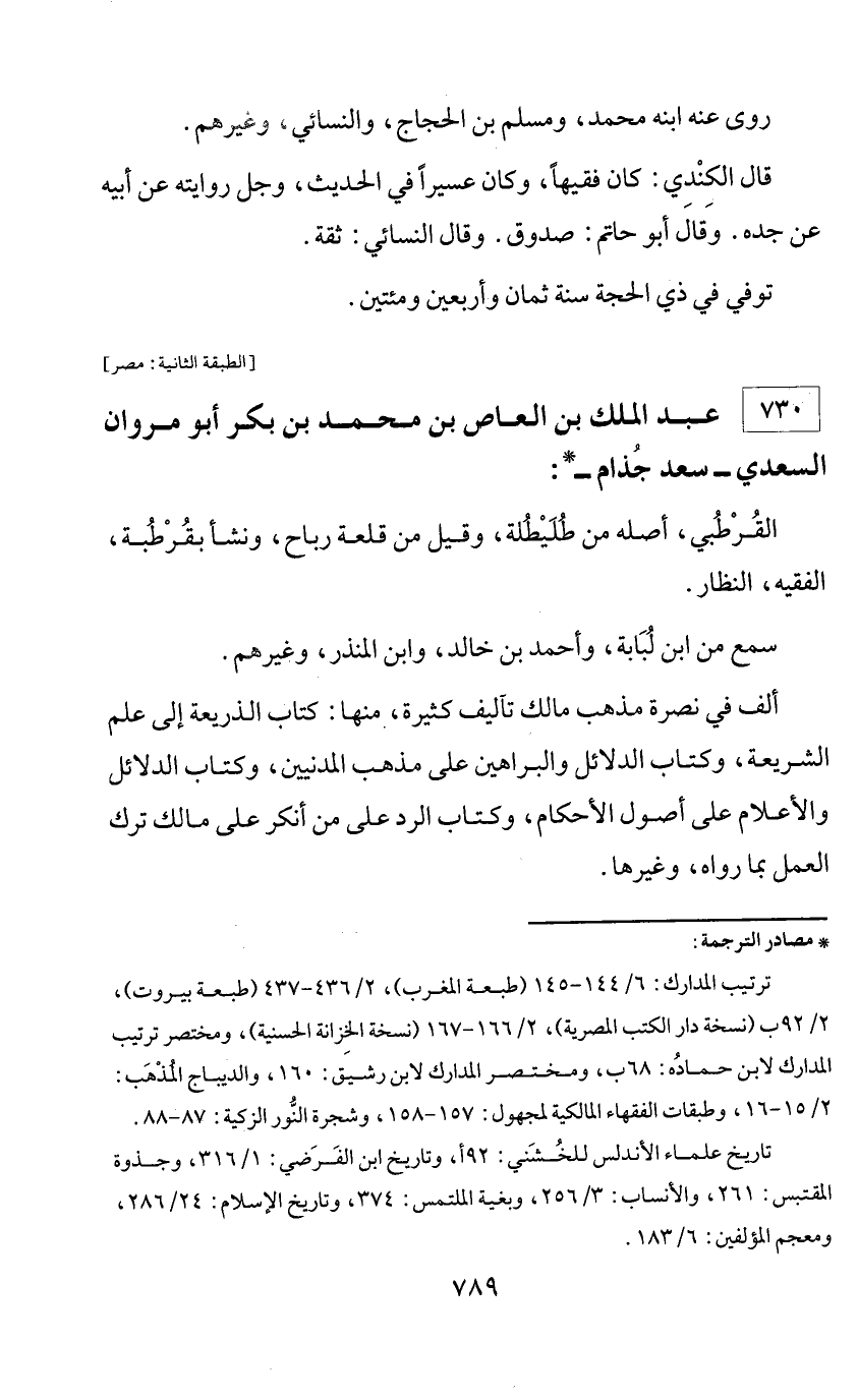 * مصادر الترجمة: ترتيب المدارك: 6/ 144 - 145 (طبعة المغرب)، 2/ 436 - 437 (طبعة بيروت)، 2/ 92 ب (نسخة دار الكتب المصرية)، 2/ 166 - 167 (نسخة الخزانة الحسنية)، ومختصر ترتيب المدارك لابن حماده: 68 ب، ومختصر المدارك لابن رشيق: 160، والديباج المذهب: 2/ 15 - 16، وطبقات الفقهاء المالكية لمجهول: 157 - 158، وشجرة النّور الزكية: 87 - 88. تاريخ علماء الأندلس للخشني: 92 أ، وتاريخ ابن الفرضي: 1/ 316، وجذوة المقتبس: 261، والأنساب: 3/ 256، وبغية الملتمس: 374، وتاريخ الإسلام: 24/ 286، ومعجم المؤلفين: 6/ 183.