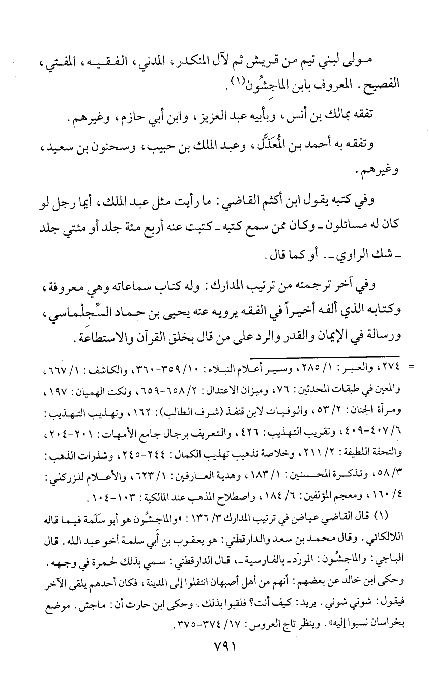 (¬1) قال القاضي عياض في ترتيب المدارك 3/ 136: «والماجشون هو أبو سلمة فيما قاله اللالكائي. وقال محمد بن سعد والدارقطني: هو يعقوب بن أبي سلمة أخو عبد الله. قال الباجي: والماجشون: المورّد - بالفارسية -، قال الدارقطني: سمي بذلك لحمرة في وجهه. وحكى ابن خالد عن بعضهم: أنهم من أهل أصبهان انتقلوا إلى المدينة، فكان أحدهم يلقى الآخر فيقول: شوني شوني. يريد: كيف أنت؟ فلقبوا بذلك. وحكى ابن حارث أن: ماجش. موضع بخراسان نسبوا إليه». وينظر تاج العروس: 17/ 374 - 375.