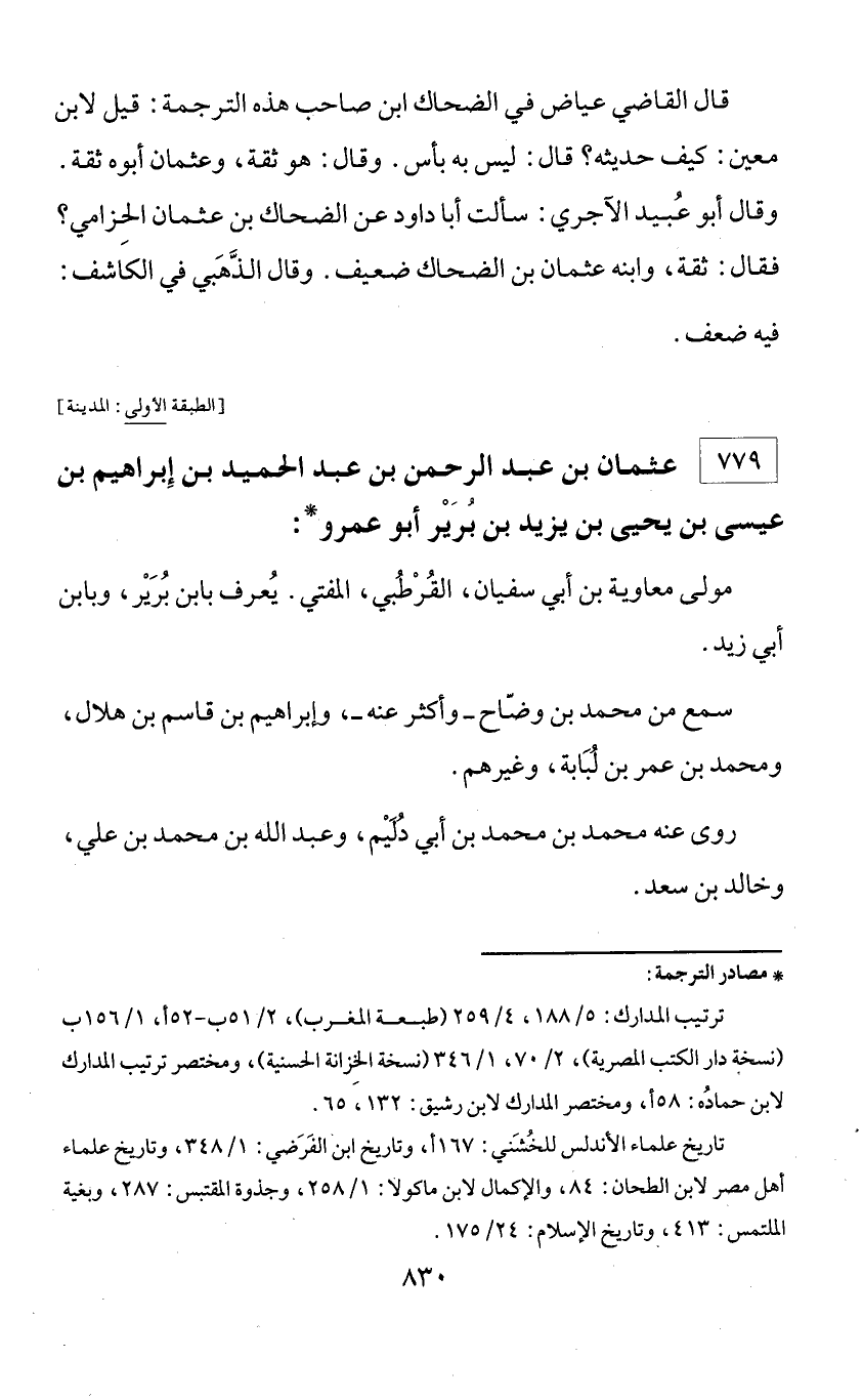 * مصادر الترجمة: ترتيب المدارك: 5/ 188، 4/ 259 (طبعة المغرب)، 2/ 51 ب - 52 أ، 1/ 156 ب (نسخة دار الكتب المصرية)، 2/ 70، 1/ 346 (نسخة الخزانة الحسنية)، ومختصر ترتيب المدارك لابن حماده: 58 أ، ومختصر المدارك لابن رشيق: 132، 65. تاريخ علماء الأندلس للخشني: 167 أ، وتاريخ ابن الفرضي: 1/ 348، وتاريخ علماء أهل مصر لابن الطحان: 84، والإكمال لابن ماكولا: 1/ 258، وجذوة المقتبس: 287، وبغية الملتمس: 413، وتاريخ الإسلام: 24/ 175.