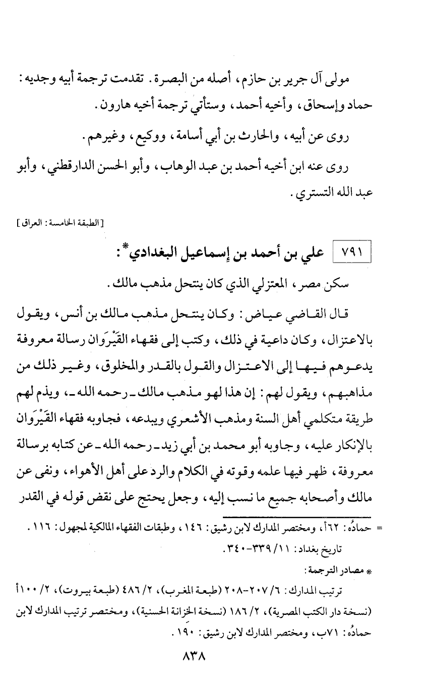 = حماده: 62 أ، ومختصر المدارك لابن رشيق: 146، وطبقات الفقهاء المالكية لمجهول: 116. تاريخ بغداد: 11/ 339 - 340.