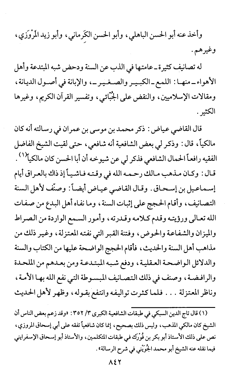 (¬1) قال تاج الدين السبكي في طبقات الشافعية الكبرى 3/ 352: «وقد زعم بعض الناس أن الشيخ كان مالكي المذهب، وليس ذلك بصحيح، إنما كان شافعيا تفقه على أبي إسحاق المروزي، نص على ذلك الأستاذ أبو بكر بن فورك في طبقات المتكلمين، والأستاذ أبو إسحاق الإسفرايني فيما نقله عنه الشيخ أبو محمد الجويني في شرح الرسالة».