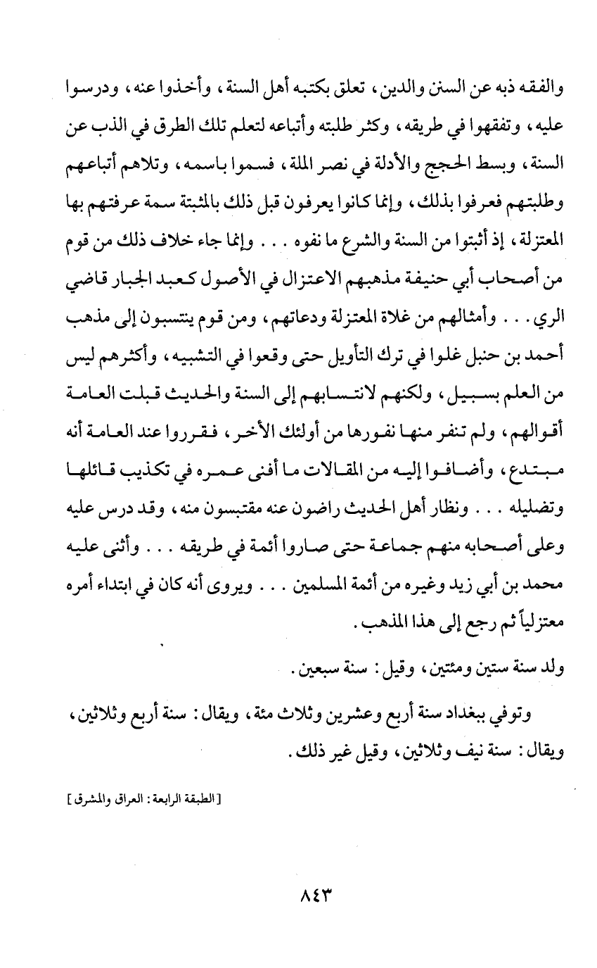 والفقه ذبه عن السنن والدين، تعلق بكتبه أهل السنة، وأخذوا عنه، ودرسوا عليه، وتفقهوا في طريقه، وكثر طلبته وأتباعه لتعلم تلك الطرق في الذب عن السنة، وبسط الحجج والأدلة في نصر الملة، فسموا باسمه، وتلاهم أتباعهم وطلبتهم فعرفوا بذلك، وإنما كانوا يعرفون قبل ذلك بالمثبتة سمة عرفتهم بها المعتزلة، إذ أثبتوا من السنة والشرع ما نفوه. . . وإنما جاء خلاف ذلك من قوم من أصحاب أبي حنيفة مذهبهم الاعتزال في الأصول كعبد الجبار قاضي الري. . . وأمثالهم من غلاة المعتزلة ودعاتهم، ومن قوم ينتسبون إلى مذهب أحمد بن حنبل غلوا في ترك التأويل حتى وقعوا في التشبيه، وأكثرهم ليس من العلم بسبيل، ولكنهم لانتسابهم إلى السنة والحديث قبلت العامة أقوالهم، ولم تنفر منها نفورها من أولئك الأخر، فقرروا عند العامة أنه مبتدع، وأضافوا إليه من المقالات ما أفنى عمره في تكذيب قائلها وتضليله. . . ونظار أهل الحديث راضون عنه مقتبسون منه، وقد درس عليه وعلى أصحابه منهم جماعة حتى صاروا أئمة في طريقه. . . وأثنى عليه محمد بن أبي زيد وغيره من أئمة المسلمين. . . ويروى أنه كان في ابتداء أمره معتزليا ثم رجع إلى هذا المذهب.