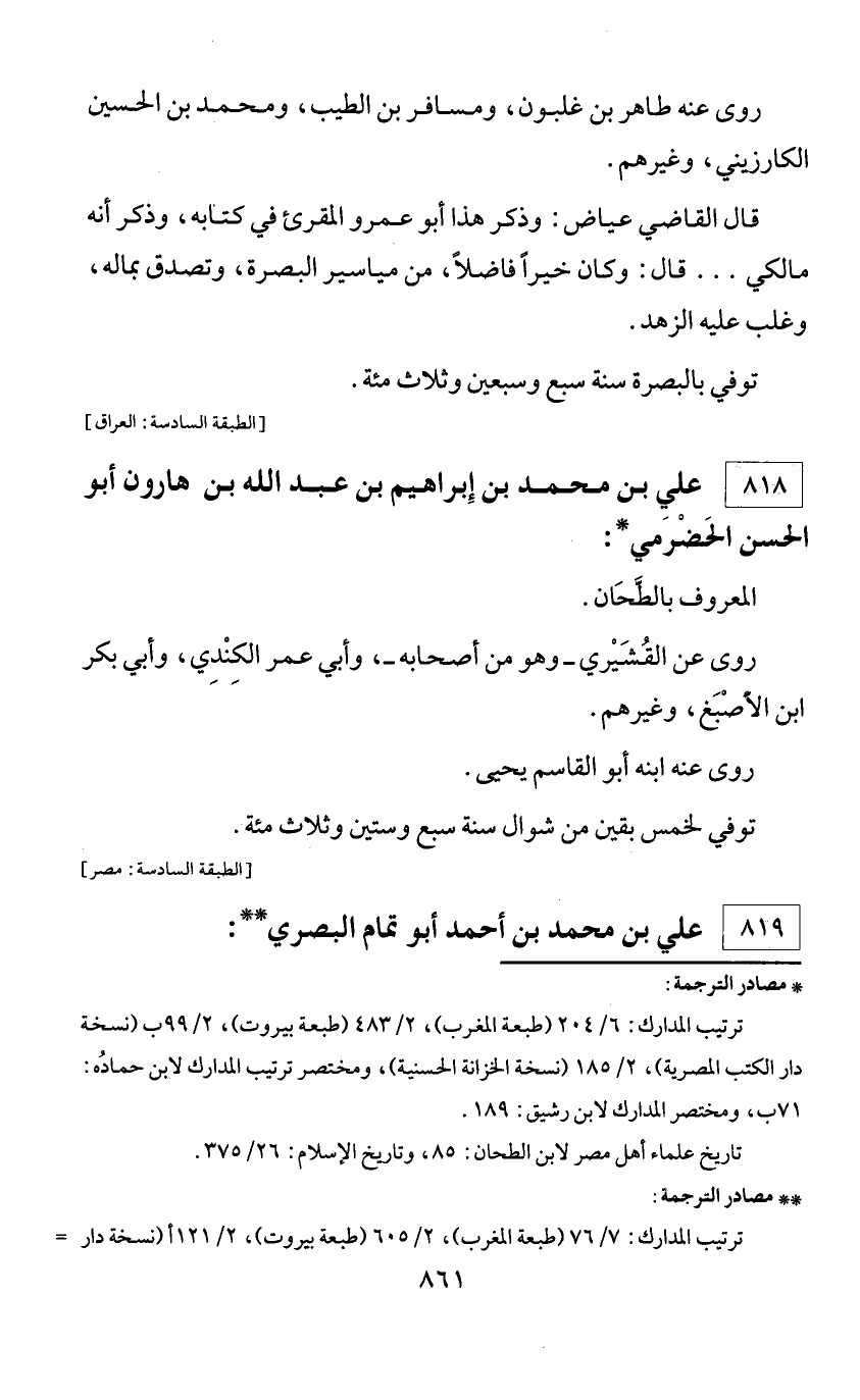 * مصادر الترجمة: ترتيب المدارك: 6/ 204 (طبعة المغرب)، 2/ 483 (طبعة بيروت)، 2/ 99 ب (نسخة دار الكتب المصرية)، 2/ 185 (نسخة الخزانة الحسنية)، ومختصر ترتيب المدارك لابن حماده: 71 ب، ومختصر المدارك لابن رشيق: 189. تاريخ علماء أهل مصر لابن الطحان: 85، وتاريخ الإسلام: 26/ 375.