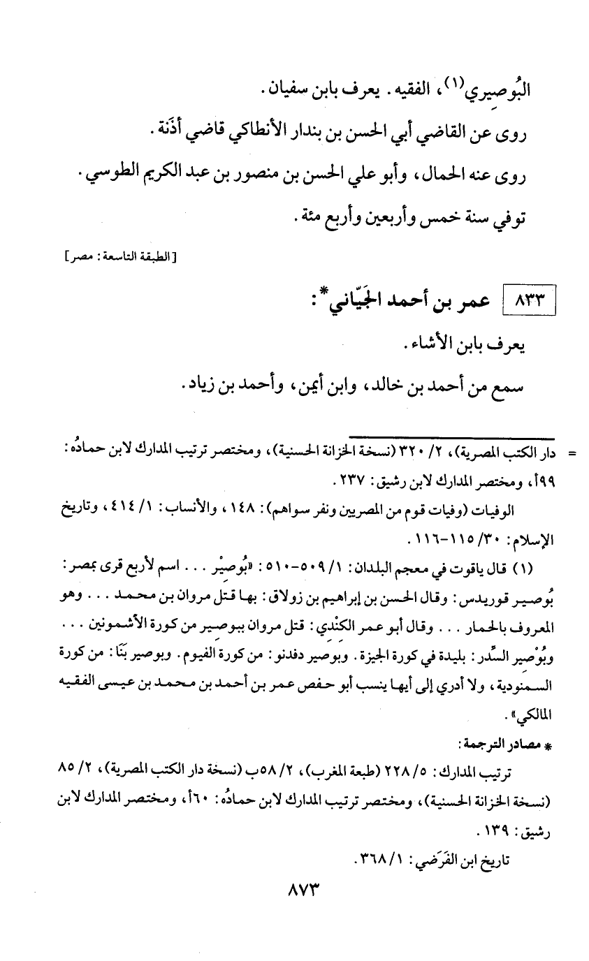 (¬1) قال ياقوت في معجم البلدان: 1/ 509 - 510: «بوصير. . . اسم لأربع قرى بمصر: بوصير قوريدس: وقال الحسن بن إبراهيم بن زولاق: بها قتل مروان بن محمد. . . وهو المعروف بالحمار. . . وقال أبو عمر الكندي: قتل مروان ببوصير من كورة الأشمونين. . . وبوصير السّدر: بليدة في كورة الجيزة. وبوصير دفدنو: من كورة الفيوم. وبوصير بنا: من كورة السمنودية، ولا أدري إلى أيها ينسب أبو حفص عمر بن أحمد بن محمد بن عيسى الفقيه المالكي».