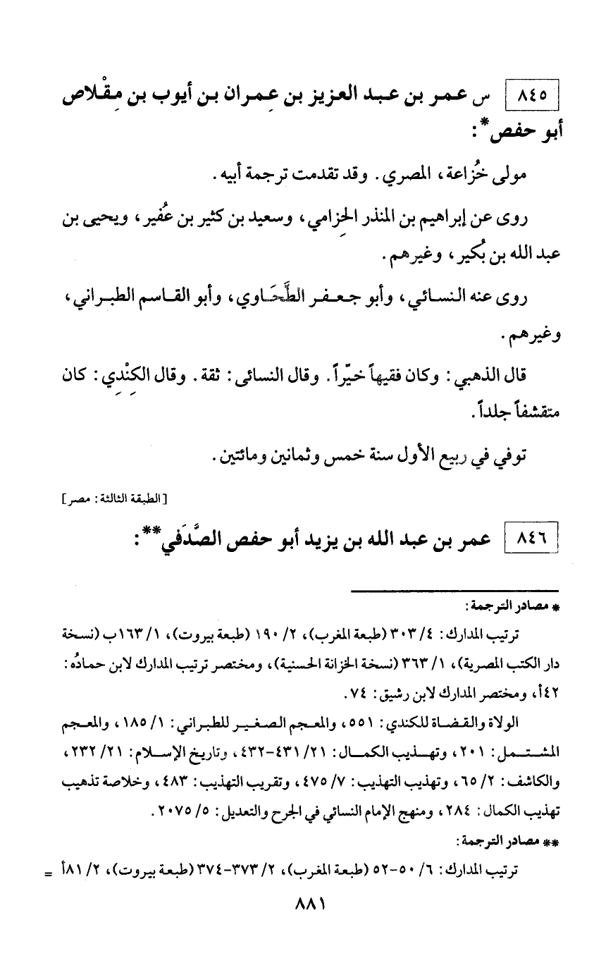 * مصادر الترجمة: ترتيب المدارك: 4/ 303 (طبعة المغرب)، 2/ 190 (طبعة بيروت)، 1/ 163 ب (نسخة دار الكتب المصرية)، 1/ 363 (نسخة الخزانة الحسنية)، ومختصر ترتيب المدارك لابن حماده: 42 أ، ومختصر المدارك لابن رشيق: 74. الولاة والقضاة للكندي: 551، والمعجم الصغير للطبراني: 1/ 185، والمعجم المشتمل: 201، وتهذيب الكمال: 21/ 431 - 432، وتاريخ الإسلام: 21/ 232، والكاشف: 2/ 65، وتهذيب التهذيب: 7/ 475، وتقريب التهذيب: 483، وخلاصة تذهيب تهذيب الكمال: 284، ومنهج الإمام النسائي في الجرح والتعديل: 5/ 2075.