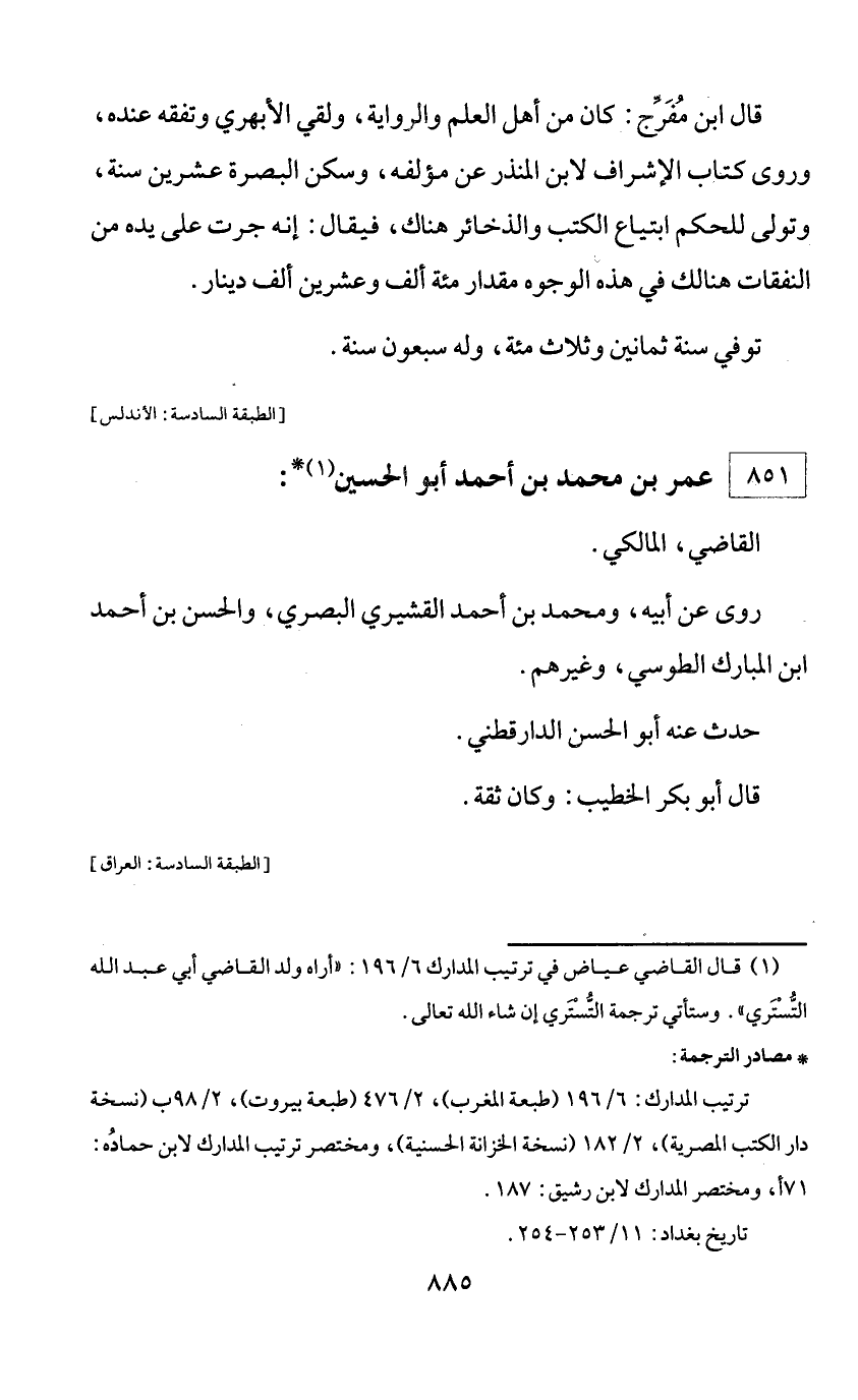 * مصادر الترجمة: ترتيب المدارك: 6/ 196 (طبعة المغرب)، 2/ 476 (طبعة بيروت)، 2/ 98 ب (نسخة دار الكتب المصرية)، 2/ 182 (نسخة الخزانة الحسنية)، ومختصر ترتيب المدارك لابن حماده: 71 أ، ومختصر المدارك لابن رشيق: 187. تاريخ بغداد: 11/ 253 - 254.