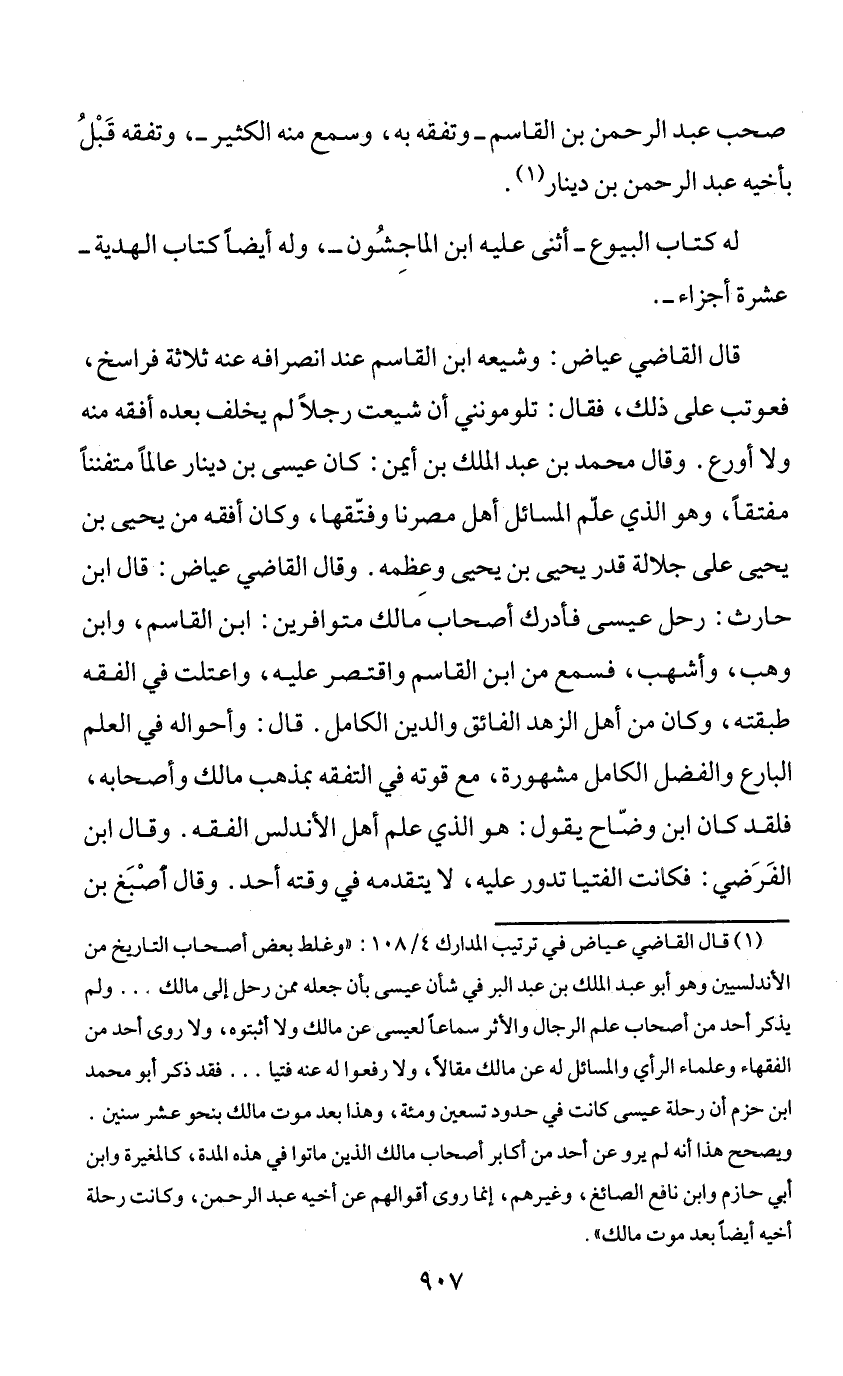 (¬1) قال القاضي عياض في ترتيب المدارك 4/ 108: «وغلط بعض أصحاب التاريخ من الأندلسيين وهو أبو عبد الملك بن عبد البر في شأن عيسى بأن جعله ممن رحل إلى مالك. . . ولم يذكر أحد من أصحاب علم الرجال والأثر سماعا لعيسى عن مالك ولا أثبتوه، ولا روى أحد من الفقهاء وعلماء الرأي والمسائل له عن مالك مقالا، ولا رفعوا له عنه فتيا. . . فقد ذكر أبو محمد ابن حزم أن رحلة عيسى كانت في حدود تسعين ومئة، وهذا بعد موت مالك بنحو عشر سنين. ويصحح هذا أنه لم يرو عن أحد من أكابر أصحاب مالك الذين ماتوا في هذه المدة، كالمغيرة وابن أبي حازم وابن نافع الصائغ، وغيرهم، إنما روى أقوالهم عن أخيه عبد الرحمن، وكانت رحلة أخيه أيضا بعد موت مالك».