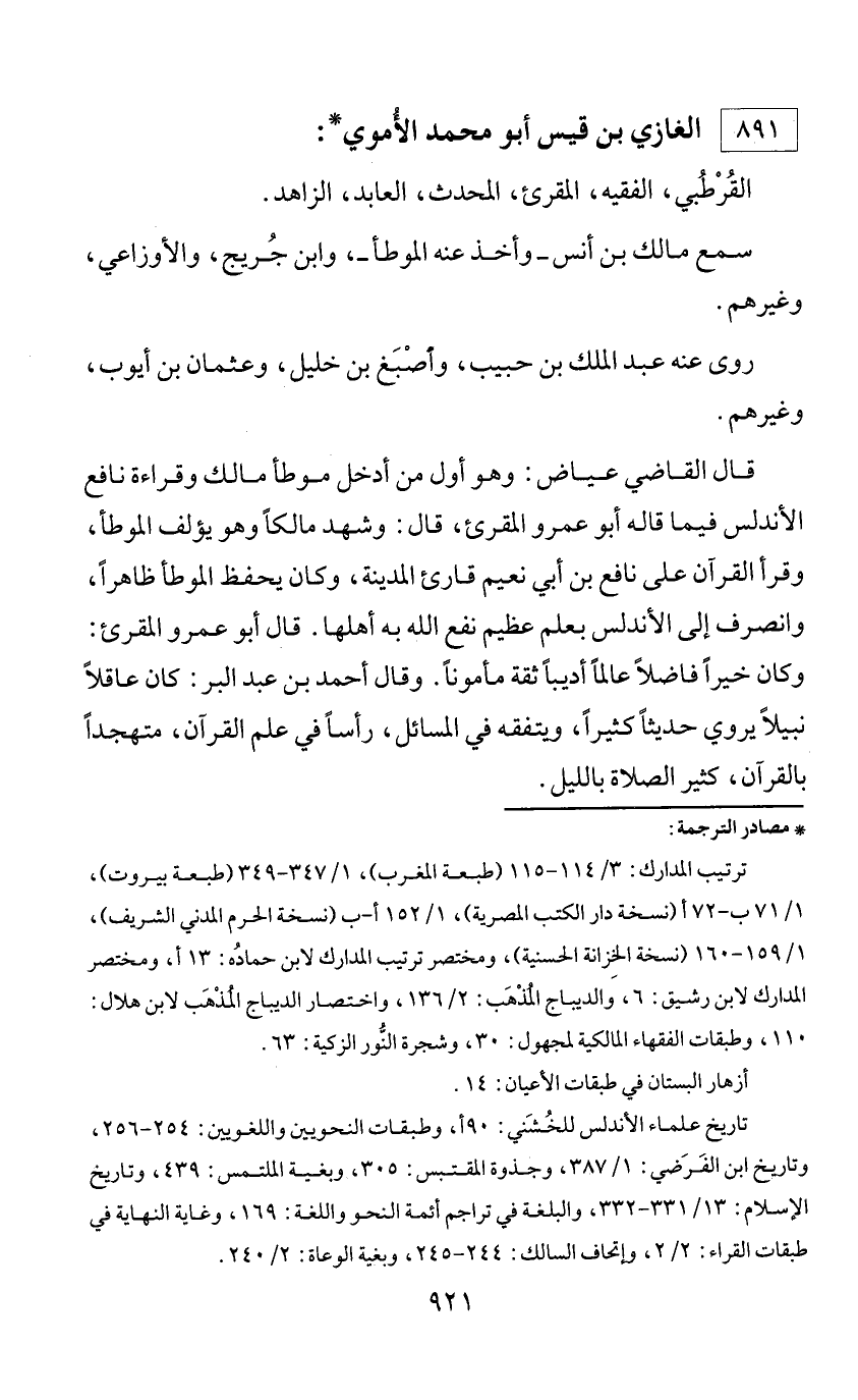 * مصادر الترجمة: ترتيب المدارك: 3/ 114 - 115 (طبعة المغرب)، 1/ 347 - 349 (طبعة بيروت)، 1/ 71 ب - 72 أ (نسخة دار الكتب المصرية)، 1/ 152 أ - ب (نسخة الحرم المدني الشريف)، 1/ 159 - 160 (نسخة الخزانة الحسنية)، ومختصر ترتيب المدارك لابن حماده: 13 أ، ومختصر المدارك لابن رشيق: 6، والديباج المذهب: 2/ 136، واختصار الديباج المذهب لابن هلال: 110، وطبقات الفقهاء المالكية لمجهول: 30، وشجرة النّور الزكية: 63. أزهار البستان في طبقات الأعيان: 14. تاريخ علماء الأندلس للخشني: 90 أ، وطبقات النحويين واللغويين: 254 - 256، وتاريخ ابن الفرضي: 1/ 387، وجذوة المقتبس: 305، وبغية الملتمس: 439، وتاريخ الإسلام: 13/ 331 - 332، والبلغة في تراجم أئمة النحو واللغة: 169، وغاية النهاية في طبقات القراء: 2/ 2، وإتحاف السالك: 244 - 245، وبغية الوعاة: 2/ 240.