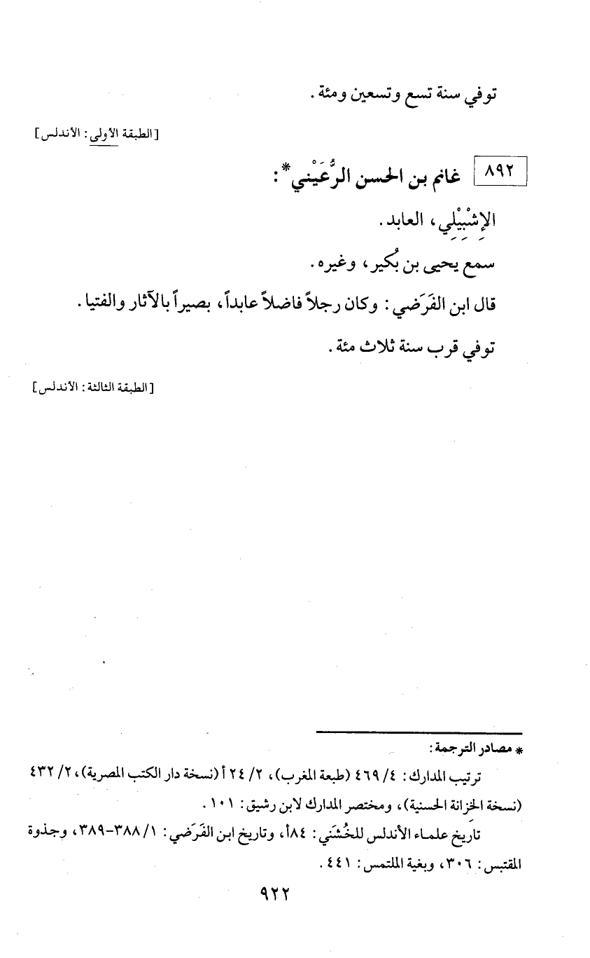 * مصادر الترجمة: ترتيب المدارك: 4/ 469 (طبعة المغرب)، 2/ 24 أ (نسخة دار الكتب المصرية)، 2/ 432 (نسخة الخزانة الحسنية)، ومختصر المدارك لابن رشيق: 101. تاريخ علماء الأندلس للخشني: 84 أ، وتاريخ ابن الفرضي: 1/ 388 - 389، وجذوة المقتبس: 306، وبغية الملتمس: 441.